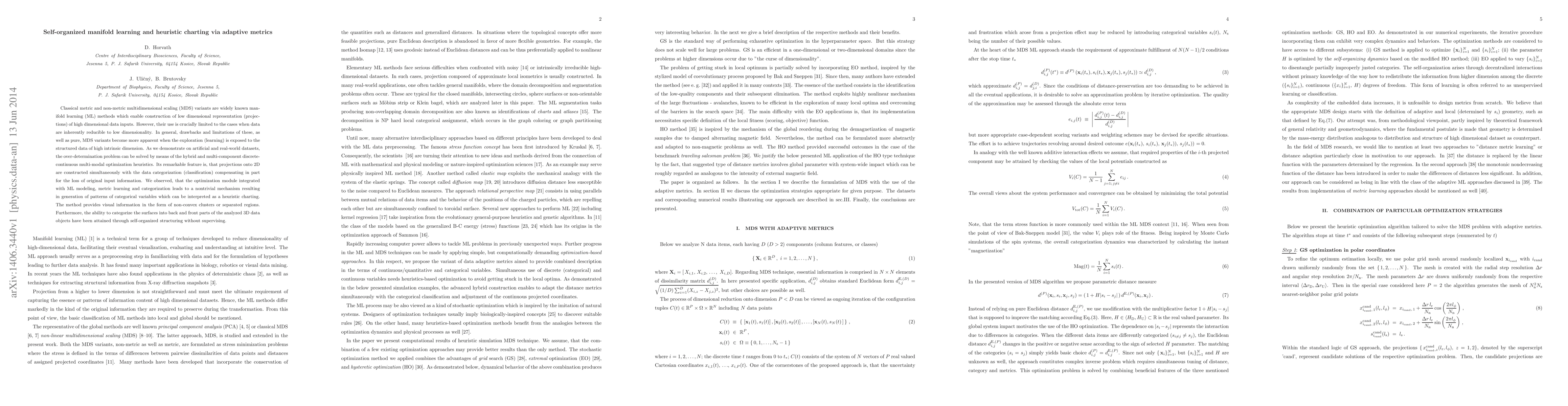 Classical metric and non-metric multidimensional scaling (MDS) variants are widely known manifold learning (ML) methods which enable construction of low dimensional representation (projections) of high dimensional data inputs. However, their use is crucially limited to the cases when data are inherently reducible to low dimensionality. In general, drawbacks and limitations of these, as well as pure, MDS variants become more apparent when the exploration (learning) is exposed to the structured data of high intrinsic dimension. As we demonstrate on artificial and real-world datasets, the over-determination problem can be solved by means of the hybrid and multi-component discrete-continuous multi-modal optimization heuristics. Its remarkable feature is, that projections onto 2D are constructed simultaneously with the data categorization (classification) compensating in part for the loss of original input information. We observed, that the optimization module integrated with ML modeling, metric learning and categorization leads to a nontrivial mechanism resulting in generation of patterns of categorical variables which can be interpreted as a heuristic charting. The method provides visual information in the form of non-convex clusters or separated regions. Furthermore, the ability to categorize the surfaces into back and front parts of the analyzed 3D data objects have been attained through self-organized structuring without supervising.