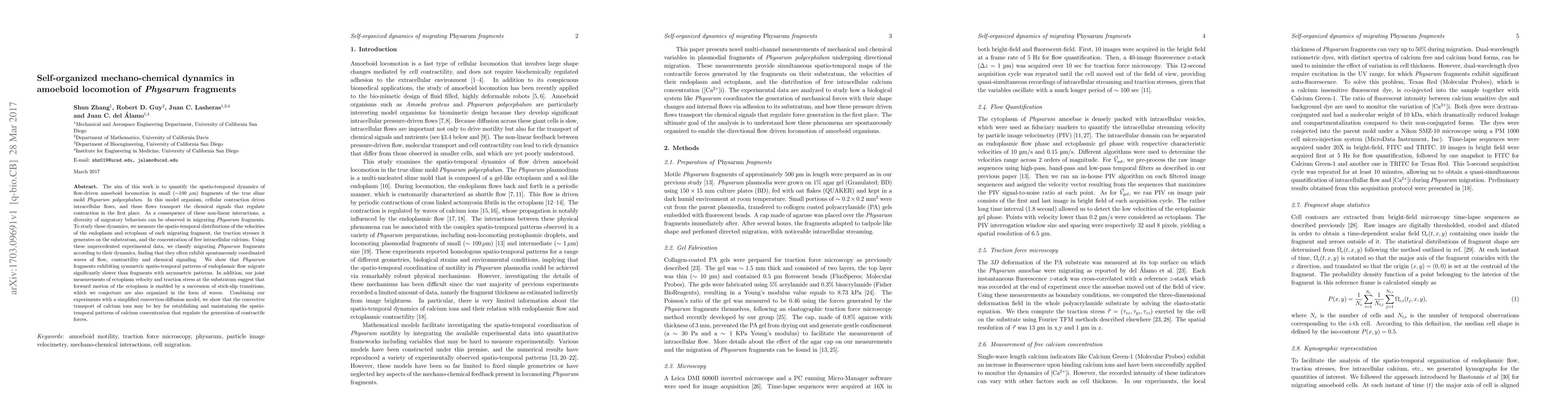 The aim of this work is to quantify the spatio-temporal dynamics of flow-driven amoeboid locomotion in small ($\sim$100 $\mu$m) fragments of the true slime mold \phys {\it polycephalum}. In this model organism, cellular contraction drives intracellular flows, and these flows transport the chemical signals that regulate contraction in the first place. As a consequence of these non-linear interactions, a diversity of migratory behaviors can be observed in migrating \phys fragments. To study these dynamics, we measure the spatio-temporal distributions of the velocities of the endoplasm and ectoplasm of each migrating fragment, the traction stresses it generates on the substratum, and the concentration of free intracellular calcium. Using these unprecedented experimental data, we classify migrating \phys fragments according to their dynamics, finding that they often exhibit spontaneously coordinated waves of flow, contractility and chemical signaling. We show that \phys fragments exhibiting symmetric spatio-temporal patterns of endoplasmic flow migrate significantly slower than fragments with asymmetric patterns. In addition, our joint measurements of ectoplasm velocity and traction stress at the substratum suggest that forward motion of the ectoplasm is enabled by a succession of stick-slip transitions, which we conjecture are also organized in the form of waves. Combining our experiments with a simplified convection-diffusion model, we show that the convective transport of calcium ions may be key for establishing and maintaining the spatio-temporal patterns of calcium concentration that regulate the generation of contractile forces.