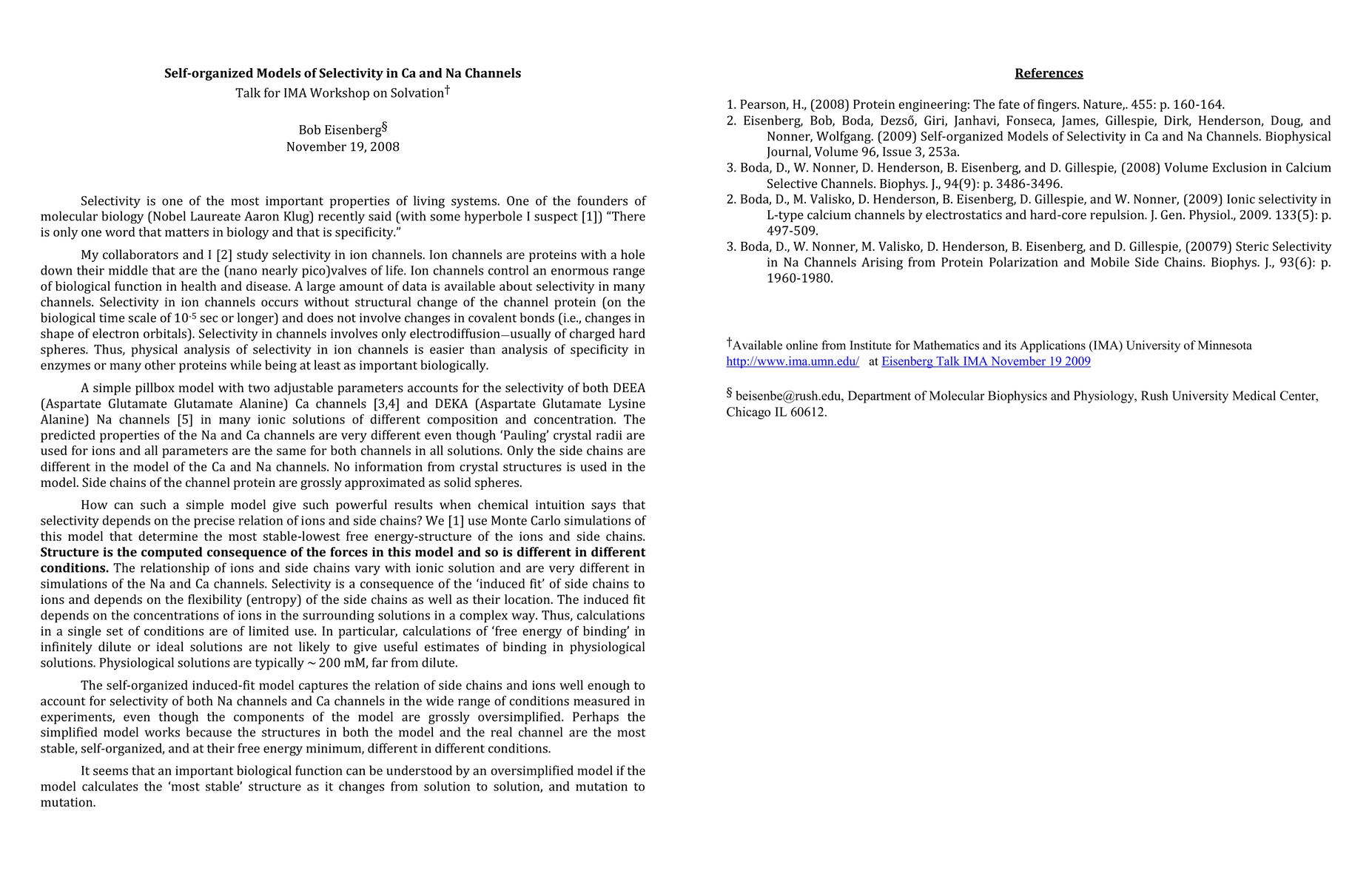 A simple pillbox model with two adjustable parameters accounts for the selectivity of both DEEA Ca channels and DEKA Na channels in many ionic solutions of different composition and concentration. Only the side chains are different in the model of the Ca and Na channels. Parameters are the same for both channels in all solutions. 'Pauling' radii are used for ions. No information from crystal structures is used in the model. Side chains are grossly approximated as spheres. The predicted properties of the Na and Ca channels are very different. How can such a simple model give such powerful results when chemical intuition says that selectivity depends on the precise relation of ions and side chains? We use Monte Carlo simulations of this model that determine the most stable-lowest free energy-structure of the ions and side chains. Structure is the computed consequence of the forces in this model. The relationship of ions and side chains vary with ionic solution and are very different in simulations of the Na and Ca channels. Selectivity is a consequence of the 'induced fit' of side chains to ions and depends on the flexibility (entropy) of the side chains as well as their location. The model captures the relation of side chains and ions well enough to account for selectivity of both Na channels and Ca channels in the wide range of conditions measured in experiments. Evidently, the structures in the real Na and Ca channels responsible for selectivity are self-organized, at their free energy minimum. Oversimplified models are enough to account for selectivity if the models calculate the 'most stable' structure as it changes from solution to solution, and mutation to mutation.