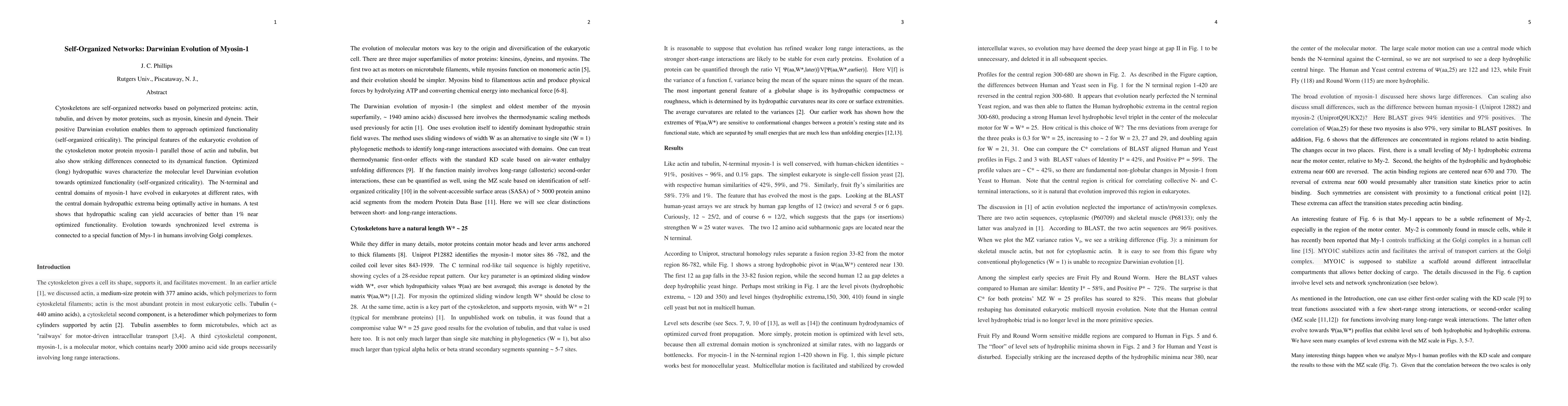 Cytoskeletons are self-organized networks based on polymerized proteins: actin, tubulin, and driven by motor proteins, such as myosin, kinesin and dynein. Their positive Darwinian evolution enables them to approach optimized functionality (self-organized criticality). The principal features of the eukaryotic evolution of the cytoskeleton motor protein myosin-1 parallel those of actin and tubulin, but also show striking differences connected to its dynamical function. Optimized (long) hydropathic waves characterize the molecular level Darwinian evolution towards optimized functionality (self-organized criticality). The N-terminal and central domains of myosin-1 have evolved in eukaryotes at different rates, with the central domain hydropathic extrema being optimally active in humans. A test shows that hydropathic scaling can yield accuracies of better than 1% near optimized functionality. Evolution towards synchronized level extrema is connected to a special function of Mys-1 in humans involving Golgi complexes.