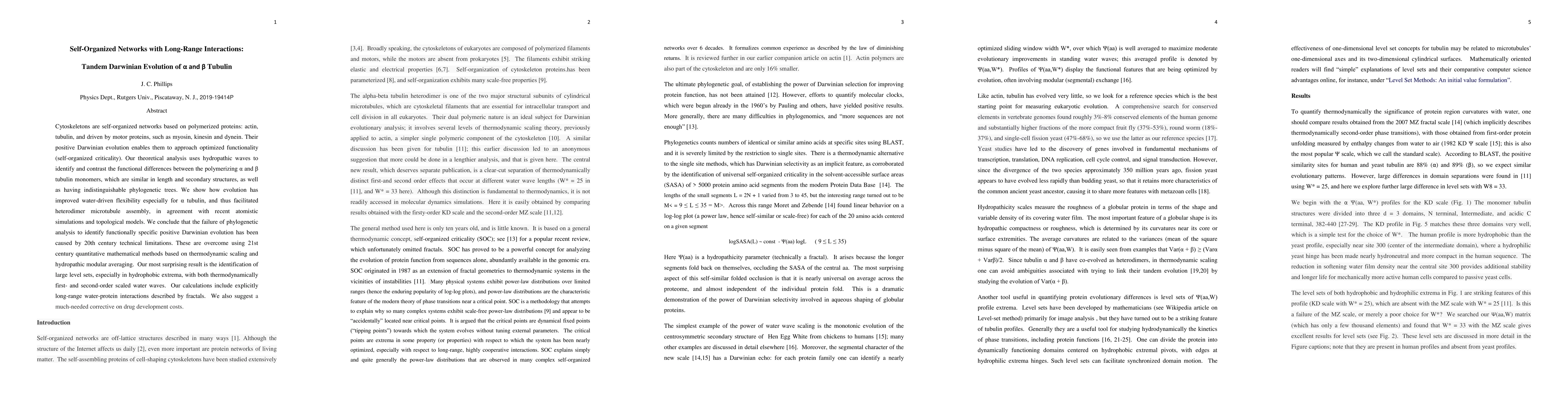 Cytoskeletons are self-organized networks based on polymerized proteins: actin, tubulin, and driven by motor proteins, such as myosin, kinesin and dynein. Their positive Darwinian evolution enables them to approach optimized functionality (self-organized criticality). Our theoretical analysis uses hydropathic waves to identify and contrast the functional differences between the polymerizing $\alpha$ and $\beta$ tubulin monomers, which are similar in length and secondary structures, as well as having indistinguishable phylogenetic trees. We show how evolution has improved water-driven flexibility especially for $\alpha$ tubulin, and thus facilitated heterodimer microtubule assembly, in agreement with recent atomistic simulations and topological models. We conclude that the failure of phylogenetic analysis to identify functionally specific positive Darwinian evolution has been caused by 20th century technical limitations. These are overcome using 21st century quantitative mathematical methods based on thermodynamic scaling and hydropathic modular averaging. Our most surprising result is the identification of large level sets, especially in hydrophobic extrema, with both thermodynamically first- and second-order scaled water waves. Our calculations include explicitly long-range water-protein interactions described by fractals. We also suggest a much-needed corrective for large protein drug development costs.