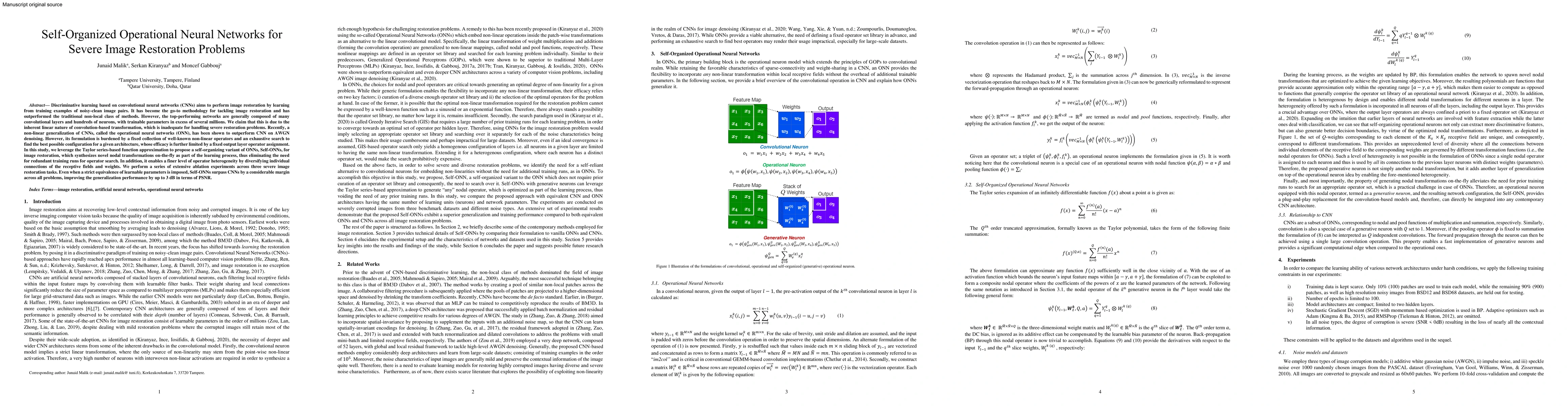 This research introduces Self-Organized Operational Neural Networks (Self-ONNs) for severe image restoration, aiming to overcome the limitations of traditional convolutional neural networks (CNNs). The proposed Self-ONNs utilize Taylor series-based function approximation to dynamically generate novel transformations during training, enhancing performance and generalization in image restoration tasks.