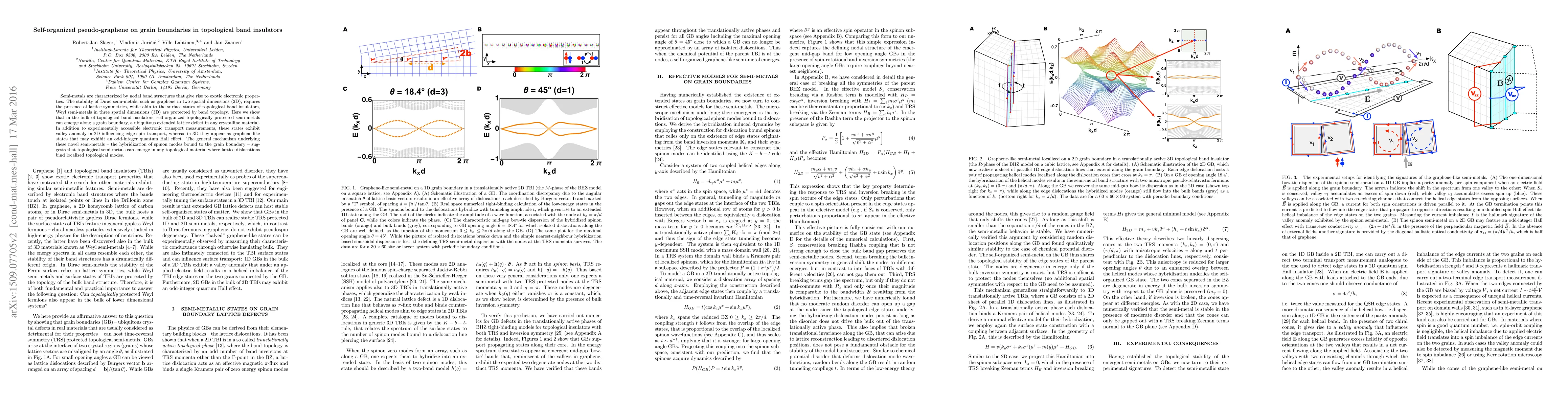 This paper explores the emergence of self-organized pseudo-graphene on grain boundaries in topological band insulators, revealing topologically protected semi-metals with unique electronic properties, including valley anomaly and potential for an odd-integer quantum Hall effect. The findings suggest a general mechanism for the formation of such semi-metals in topological materials.