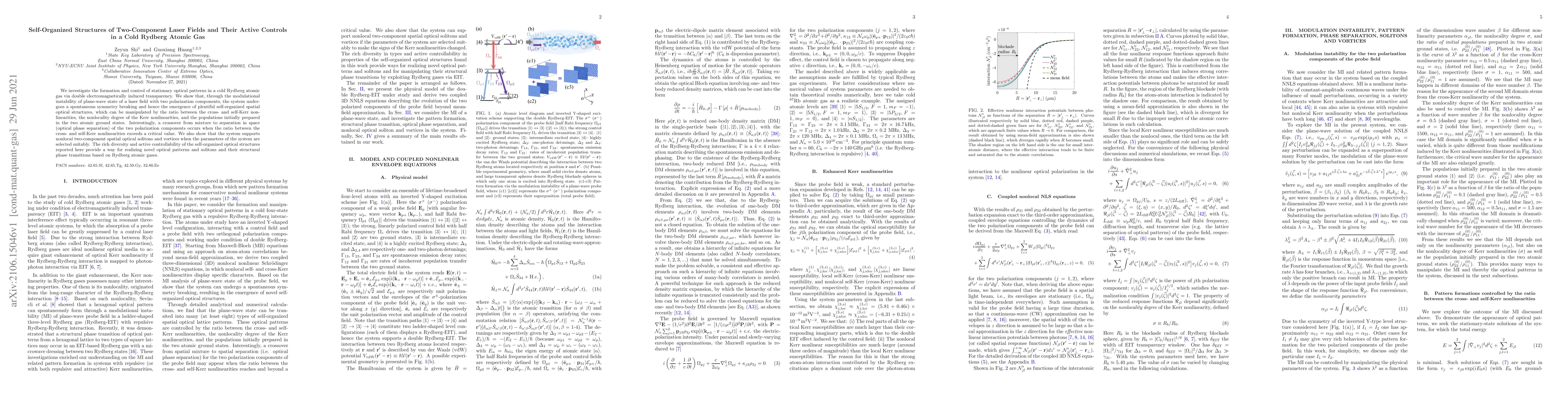 This paper explores the spontaneous formation and active control of self-organized optical patterns in a cold Rydberg atomic gas using double electromagnetically induced transparency. The study reveals that modulational instability leads to diverse spatial optical structures, which can be manipulated by various nonlinearities and initial atomic populations, including a phase transition from mixture to spatial separation of polarization components.