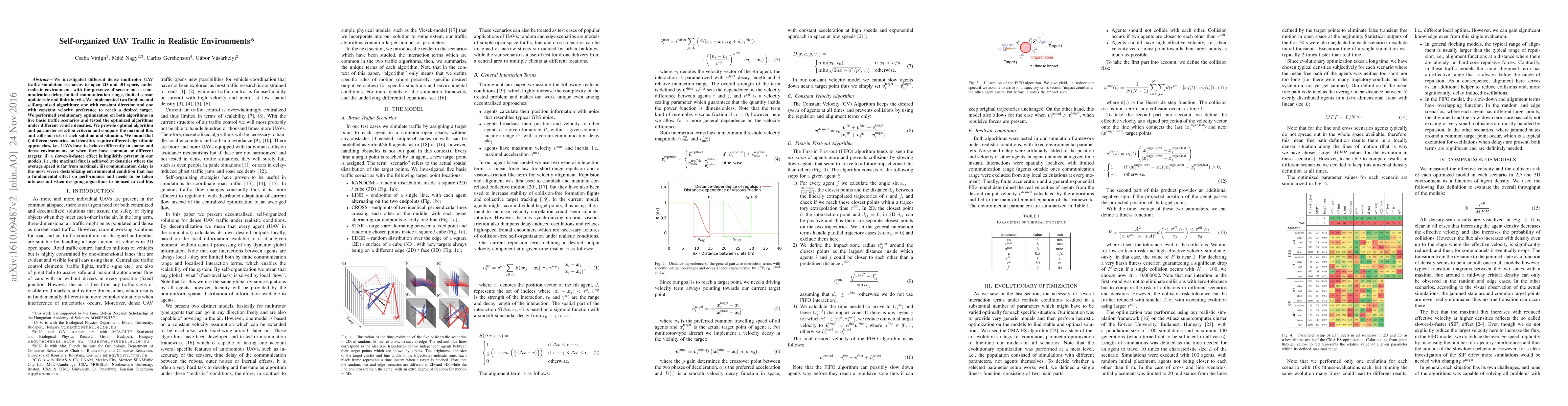 We investigated different dense multirotor UAV traffic simulation scenarios in open 2D and 3D space, under realistic environments with the presence of sensor noise, communication delay, limited communication range, limited sensor update rate and finite inertia. We implemented two fundamental self-organized algorithms: one with constant direction and one with constant velocity preference to reach a desired target. We performed evolutionary optimization on both algorithms in five basic traffic scenarios and tested the optimized algorithms under different vehicle densities. We provide optimal algorithm and parameter selection criteria and compare the maximal flux and collision risk of each solution and situation. We found that i) different scenarios and densities require different algorithmic approaches, i.e., UAVs have to behave differently in sparse and dense environments or when they have common or different targets; ii) a slower-is-faster effect is implicitly present in our models, i.e., the maximal flux is achieved at densities where the average speed is far from maximal; iii) communication delay is the most severe destabilizing environmental condition that has a fundamental effect on performance and needs to be taken into account when designing algorithms to be used in real life.