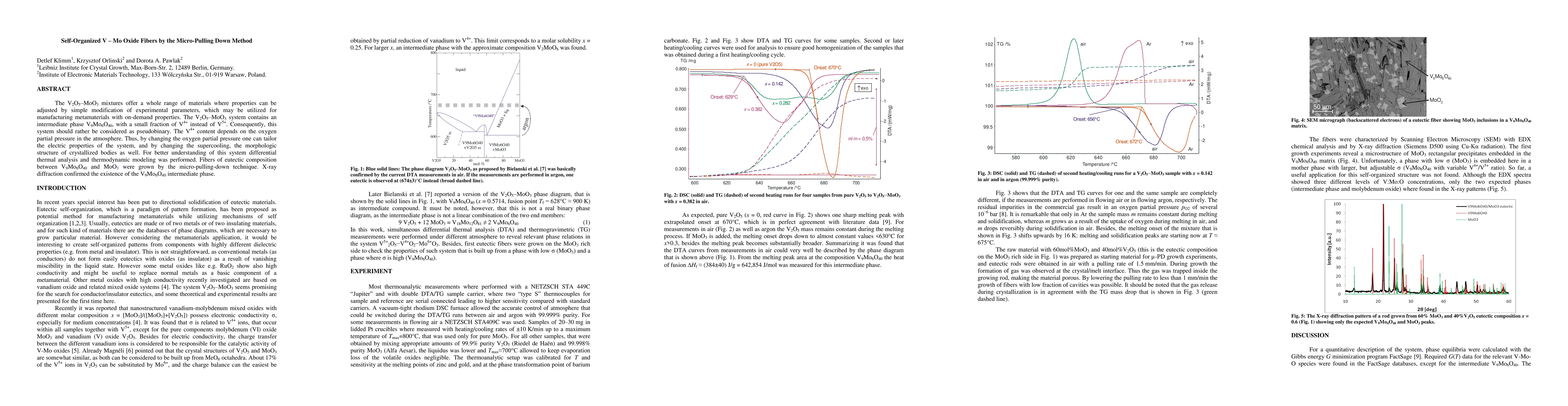 The V2O5-MoO3 mixtures offer a whole range of materials where properties can be adjusted by simple modification of experimental parameters, which may be utilized in manufacturing of metamaterials with on-demand properties. The V2O5-MoO3 system contains an intermediate phase V9Mo6O40, with a small fraction of V4+ instead of V5+. Consequently, this system should rather be considered as pseudobinary. The V4+ content depends on the oxygen partial pressure in the atmosphere. Thus, by changing the oxygen partial pressure one can tailor the electric properties of the system, and by changing the supercooling, the morphologic structure of crystallized bodies as well. For better understanding of this system differential thermal analysis and thermodynamic modeling was performed. Fibers of eutectic composition between V9Mo6O40 and MoO3 were grown by the micro-pulling-down technique. X-ray diffraction confirmed the existence of the V9Mo6O40 intermediate phase.
