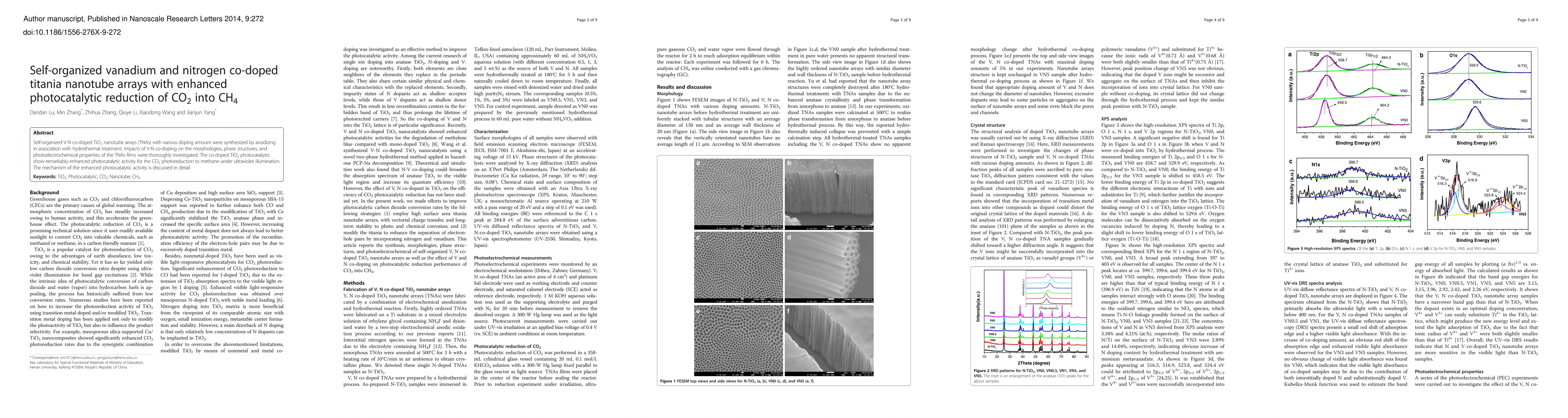 Self-organized vanadium and nitrogen co-doped TiO2 nanotube arrays exhibit significantly enhanced photocatalytic reduction of CO2 to CH4. The doping improves the photoelectrochemical properties and overall activity of the photocatalyst under UV light.