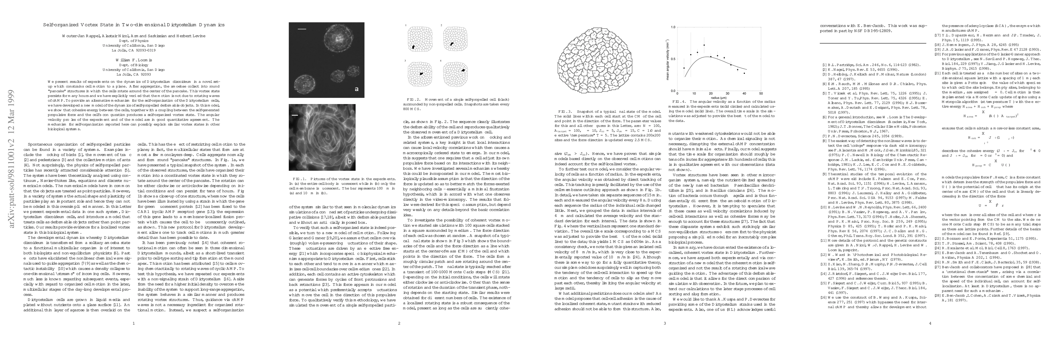 We present results of experiments on the dynamics of Dictyostelium discoideum in a novel set-up which constraints cell motion to a plane. After aggregation, the amoebae collect into round ''pancake" structures in which the cells rotate around the center of the pancake. This vortex state persists for many hours and we have explicitly verified that the motion is not due to rotating waves of cAMP. To provide an alternative mechanism for the self-organization of the Dictyostelium cells, we have developed a new model of the dynamics of self-propelled deformable objects. In this model, we show that cohesive energy between the cells, together with a coupling between the self-generated propulsive force and the cell's configuration produces a self-organized vortex state. The angular velocity profiles of the experiment and of the model are qualitatively similar. The mechanism for self-organization reported here can possibly explain similar vortex states in other biological systems.