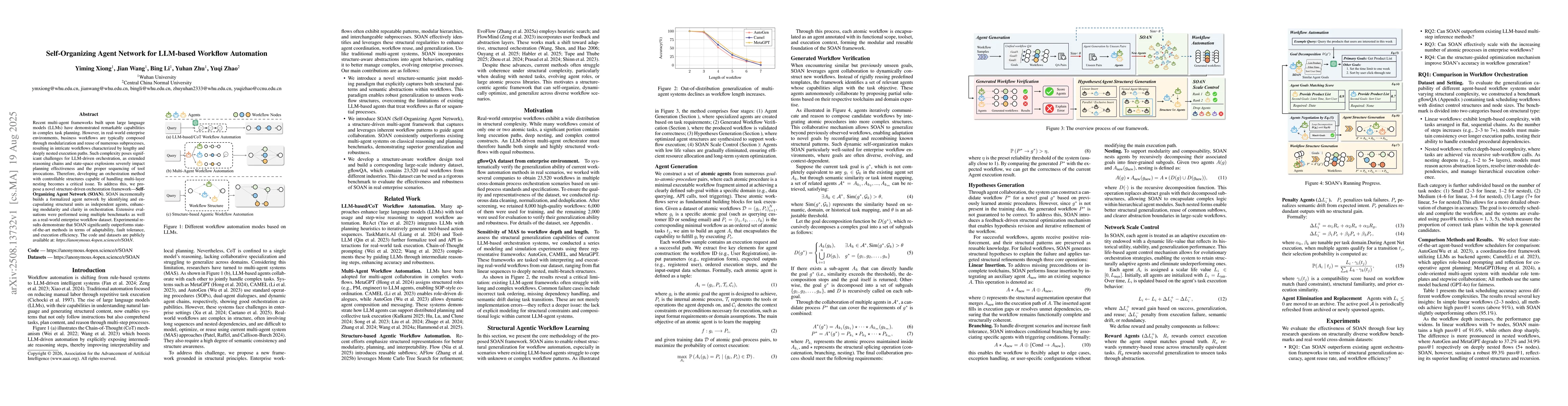 The research proposes Self-Organizing Agent Network (SOAN), a structure-driven orchestration framework for LLM-based workflow automation. SOAN incrementally builds a formalized agent network by identifying and encapsulating structural units as independent agents, enhancing modularity and clarity in orchestration.