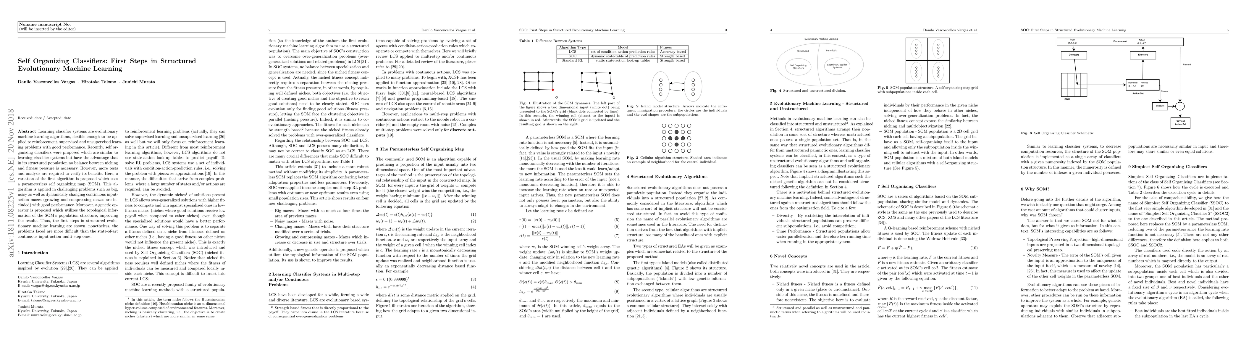 Learning classifier systems (LCSs) are evolutionary machine learning algorithms, flexible enough to be applied to reinforcement, supervised and unsupervised learning problems with good performance. Recently, self organizing classifiers were proposed which are similar to LCSs but have the advantage that in its structured population no balance between niching and fitness pressure is necessary. However, more tests and analysis are required to verify its benefits. Here, a variation of the first algorithm is proposed which uses a parameterless self organizing map (SOM). This algorithm is applied in challenging problems such as big, noisy as well as dynamically changing continuous input-action mazes (growing and compressing mazes are included) with good performance. Moreover, a genetic operator is proposed which utilizes the topological information of the SOM's population structure, improving the results. Thus, the first steps in structured evolutionary machine learning are shown, nonetheless, the problems faced are more difficult than the state-of-art continuous input-action multi-step ones.