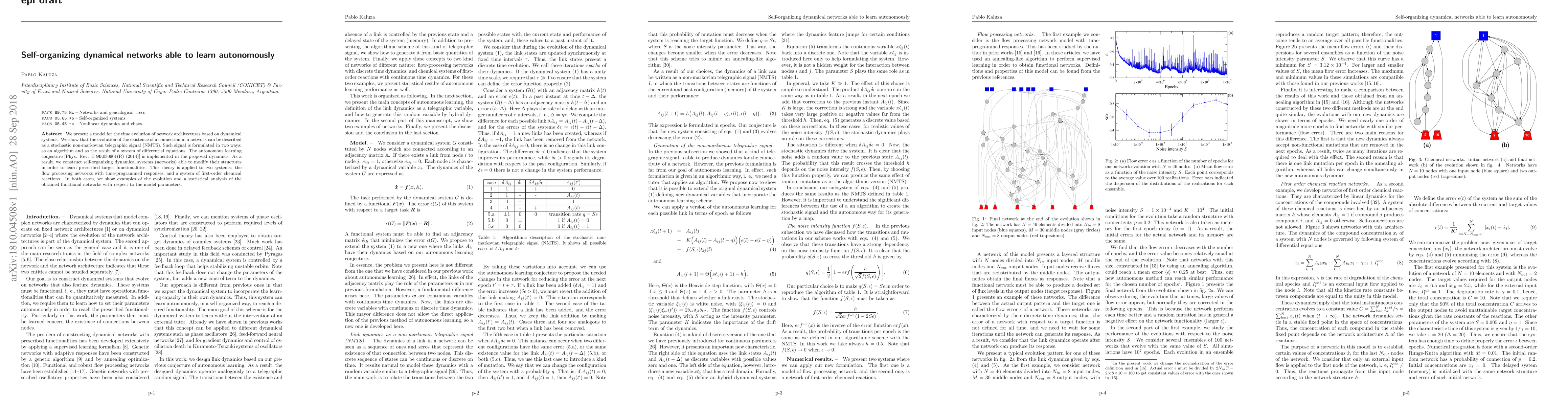 We present a model for the time evolution of network architectures based on dynamical systems. We show that the evolution of the existence of a connection in a network can be described as a stochastic non-markovian telegraphic signal (NMTS). Such signal is formulated in two ways: as an algorithm and as the result of a system of differential equations. The autonomous learning conjecture [Phys. Rev. E \textbf{90},030901(R) (2014)] is implemented in the proposed dynamics. As a result, we construct self-organizing dynamical systems (networks) able to modify their structures in order to learn prescribed target functionalities. This theory is applied to two systems: the flow processing networks with time-programmed responses, and a system of first-order chemical reactions. In both cases, we show examples of the evolution and a statistical analysis of the obtained functional networks with respect to the model parameters.
