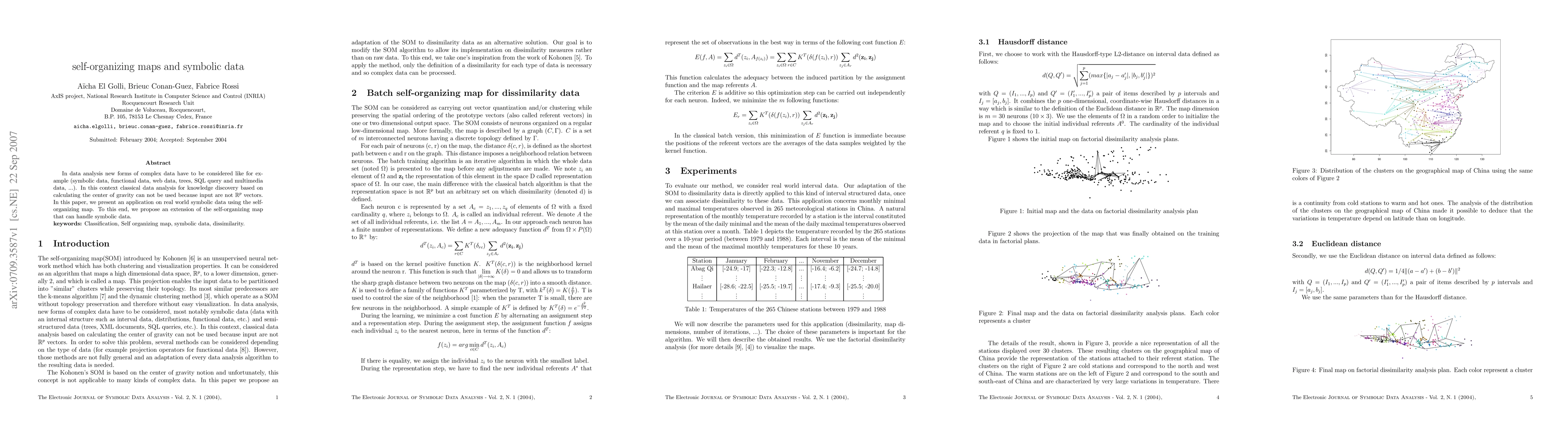 In data analysis new forms of complex data have to be considered like for example (symbolic data, functional data, web data, trees, SQL query and multimedia data, ...). In this context classical data analysis for knowledge discovery based on calculating the center of gravity can not be used because input are not $\mathbb{R}^p$ vectors. In this paper, we present an application on real world symbolic data using the self-organizing map. To this end, we propose an extension of the self-organizing map that can handle symbolic data.