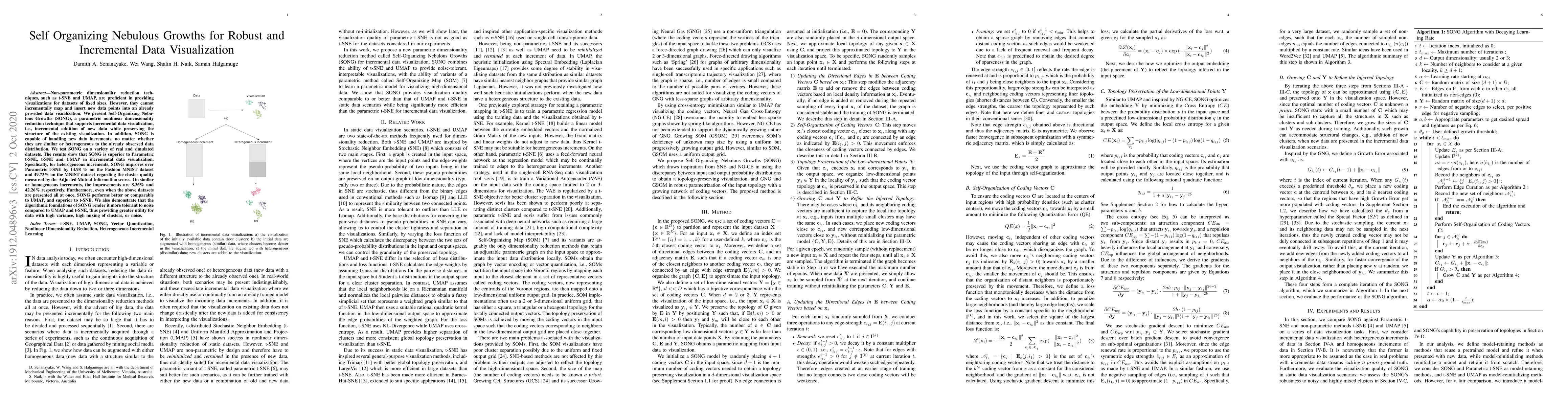 The paper introduces Self-Organizing Nebulous Growths (SONG), a parametric nonlinear dimensionality reduction technique that enables incremental data visualization while preserving existing structure. SONG outperforms existing methods like Parametric t-SNE, t-SNE, and UMAP in handling both similar and heterogeneous data increments, especially in noisy or mixed datasets.