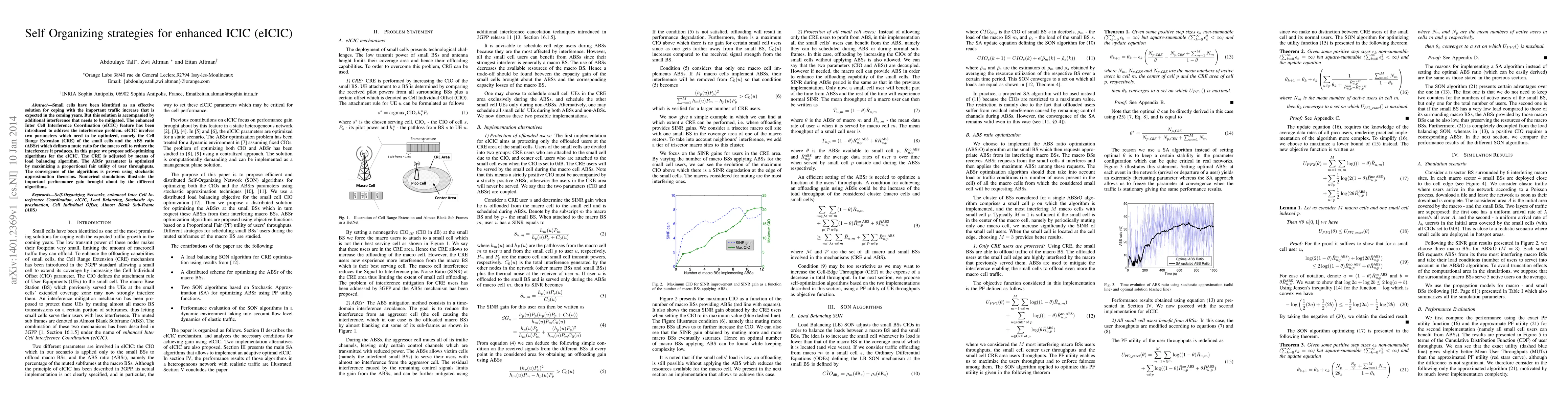 This paper proposes self-optimizing algorithms for enhanced Inter Cell Interference Coordination (eICIC) to mitigate interference from small cells. The algorithms optimize Cell Range Extension (CRE) via load balancing and ABS ratio (ABSr) to maximize user throughput, demonstrating significant performance gains through simulations.