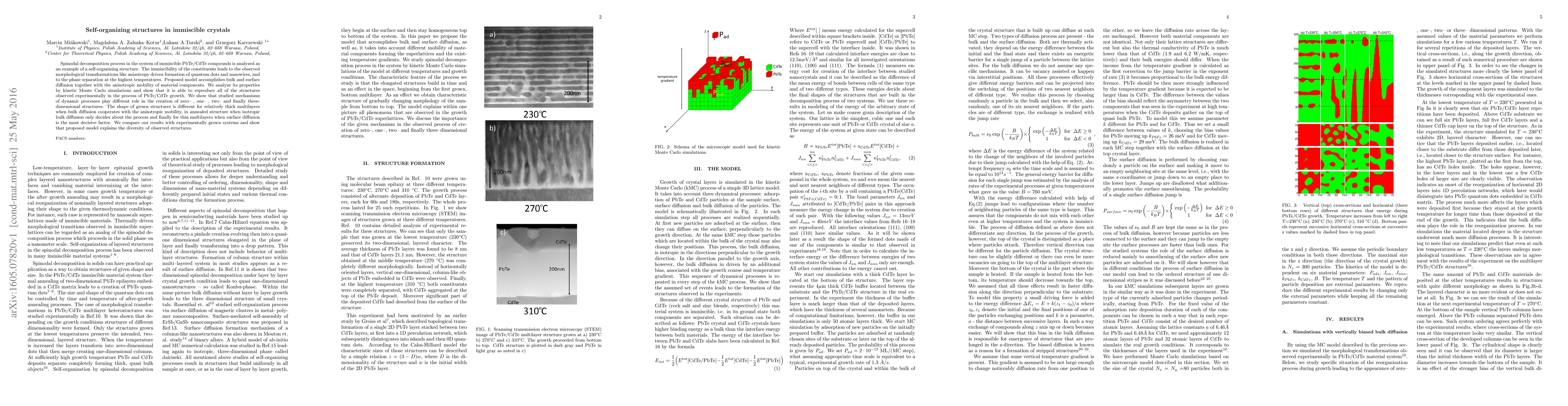 Spinodal decomposition process in the system of immiscible PbTe/CdTe compounds is analyzed as an example of a self-organizing structure. The immiscibility of the constituents leads to the observed morphological transformations like anisotropy driven formation of quantum dots and nanowires, and to the phase separation at the highest temperatures. Proposed model accomplishes bulk and surface diffusion together with the anisotropic mobility of material components. We analyze its properties by kinetic Monte Carlo simulations and show that it is able to reproduce all of the structures observed experimentally in the process of PbTe/CdTe growth. We show that studied mechanisms of dynamic processes play different role in the creation of zero--, one--, two-- and finally three-dimensional structures. The shape of grown structures is different for relatively thick multilayers when bulk diffusion cooperates with the anisotropic mobility, in annealed structure when isotropic bulk diffusion only decides about the process and finally for thin multilayers when surface diffusion is the most decisive factor. We compare our results with experimentally grown systems and show that proposed model explains the diversity of observed structures.