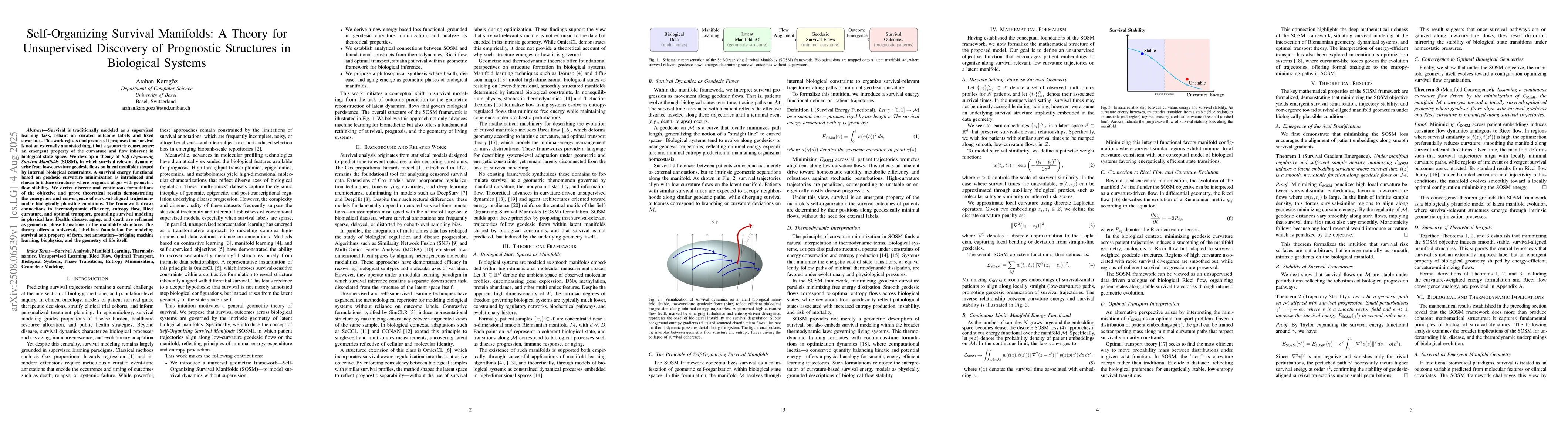 Survival is traditionally modeled as a supervised learning task, reliant on curated outcome labels and fixed covariates. This work rejects that premise. It proposes that survival is not an externally annotated target but a geometric consequence: an emergent property of the curvature and flow inherent in biological state space. We develop a theory of Self-Organizing Survival Manifolds (SOSM), in which survival-relevant dynamics arise from low-curvature geodesic flows on latent manifolds shaped by internal biological constraints. A survival energy functional based on geodesic curvature minimization is introduced and shown to induce structures where prognosis aligns with geometric flow stability. We derive discrete and continuous formulations of the objective and prove theoretical results demonstrating the emergence and convergence of survival-aligned trajectories under biologically plausible conditions. The framework draws connections to thermodynamic efficiency, entropy flow, Ricci curvature, and optimal transport, grounding survival modeling in physical law. Health, disease, aging, and death are reframed as geometric phase transitions in the manifold's structure. This theory offers a universal, label-free foundation for modeling survival as a property of form, not annotation-bridging machine learning, biophysics, and the geometry of life itself.