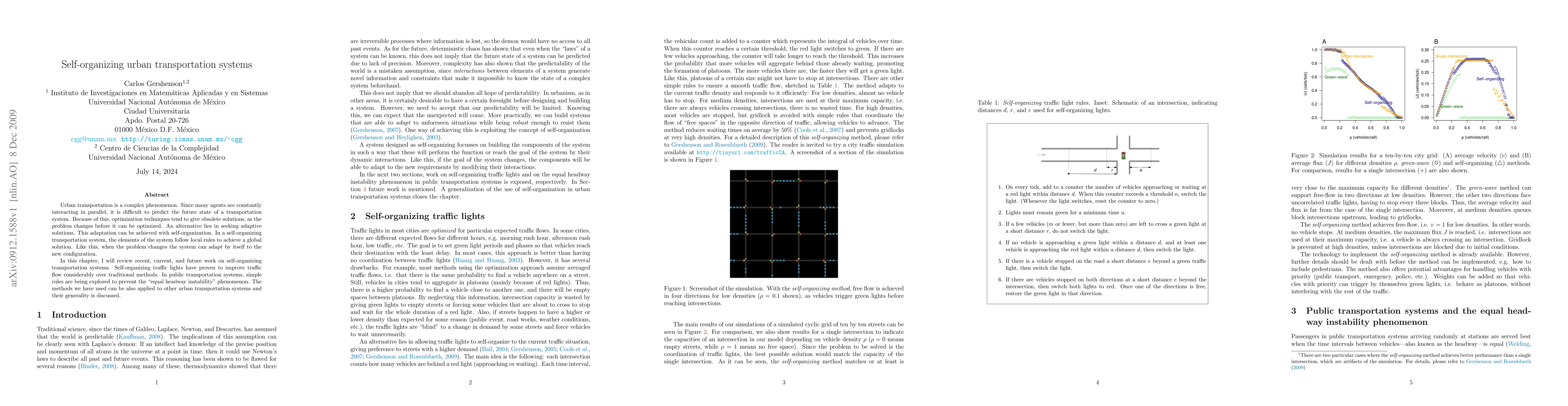 This paper reviews adaptive, self-organizing solutions for urban transportation systems, emphasizing their ability to dynamically adjust to changes. It highlights successful applications like self-organizing traffic lights and explores simple rules to prevent instability in public transportation.