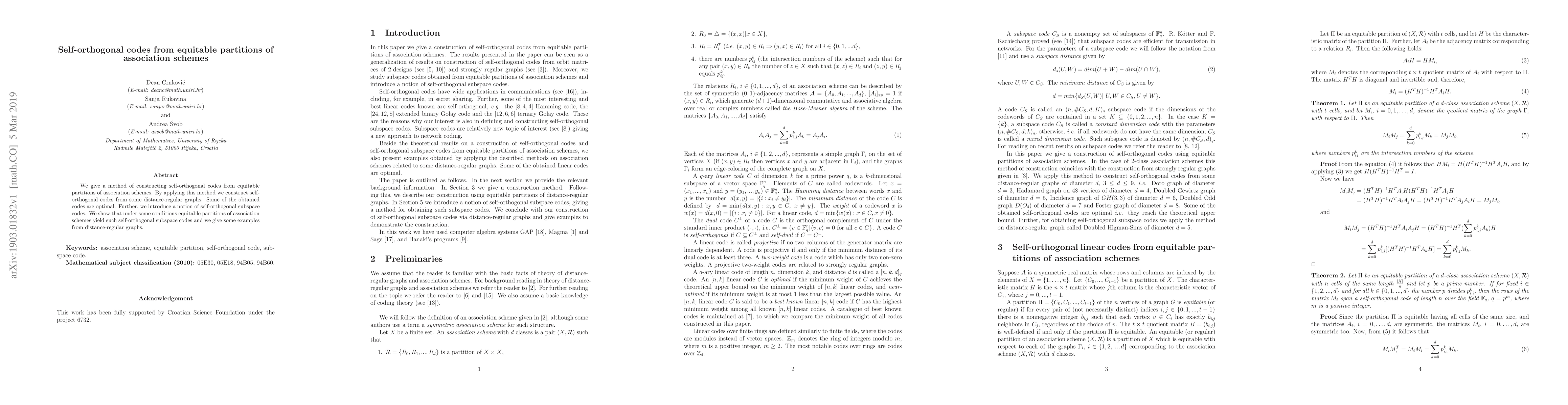 This paper presents a method to construct self-orthogonal codes from equitable partitions of association schemes, successfully applying it to distance-regular graphs to obtain optimal codes. It also introduces self-orthogonal subspace codes, demonstrating that certain conditions yield these codes from distance-regular graphs.