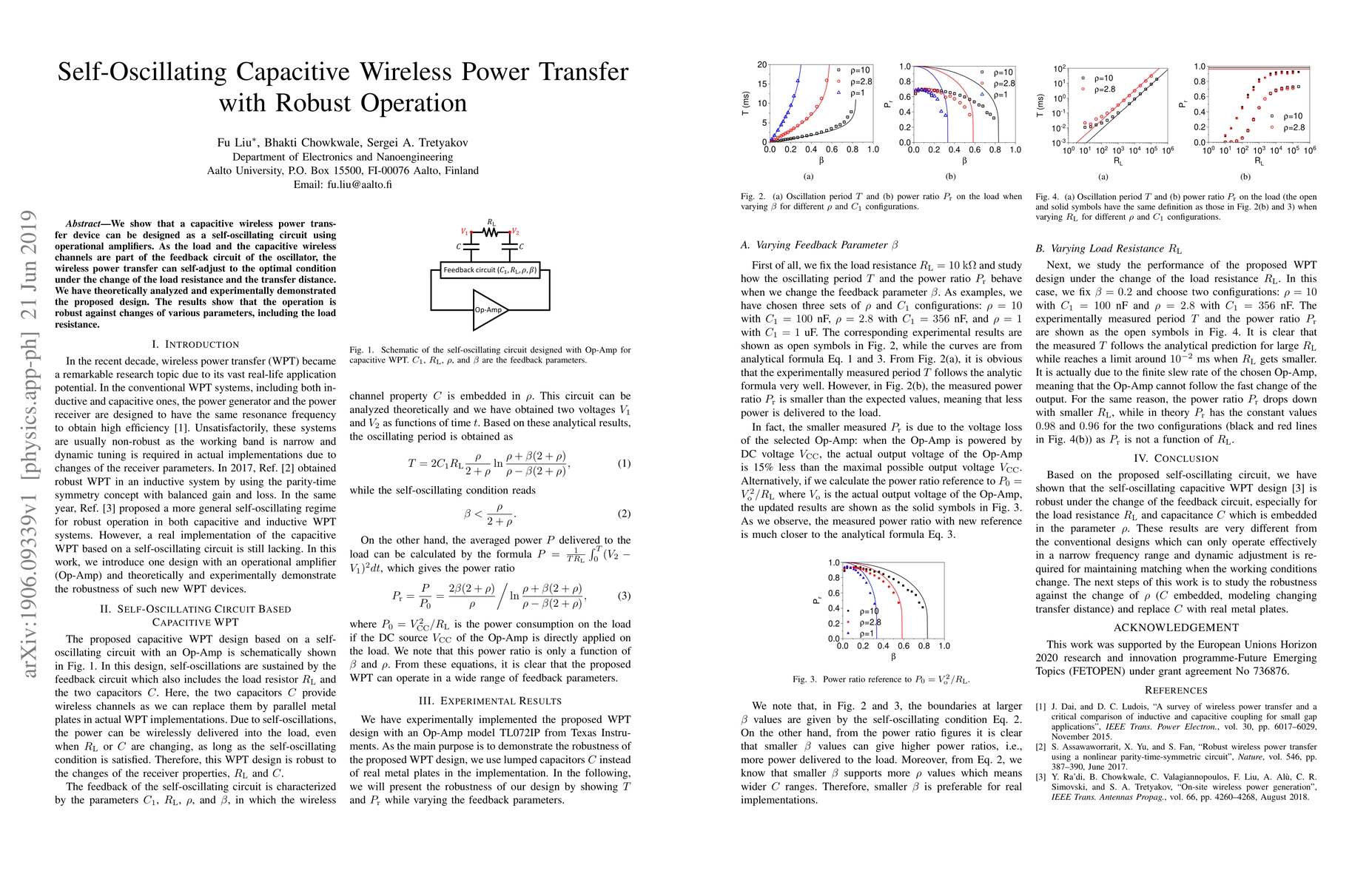 This paper proposes a self-oscillating capacitive wireless power transfer system using operational amplifiers that adjusts optimally to varying load resistance and transfer distance. Theoretical and experimental results demonstrate robust operation under parameter changes.