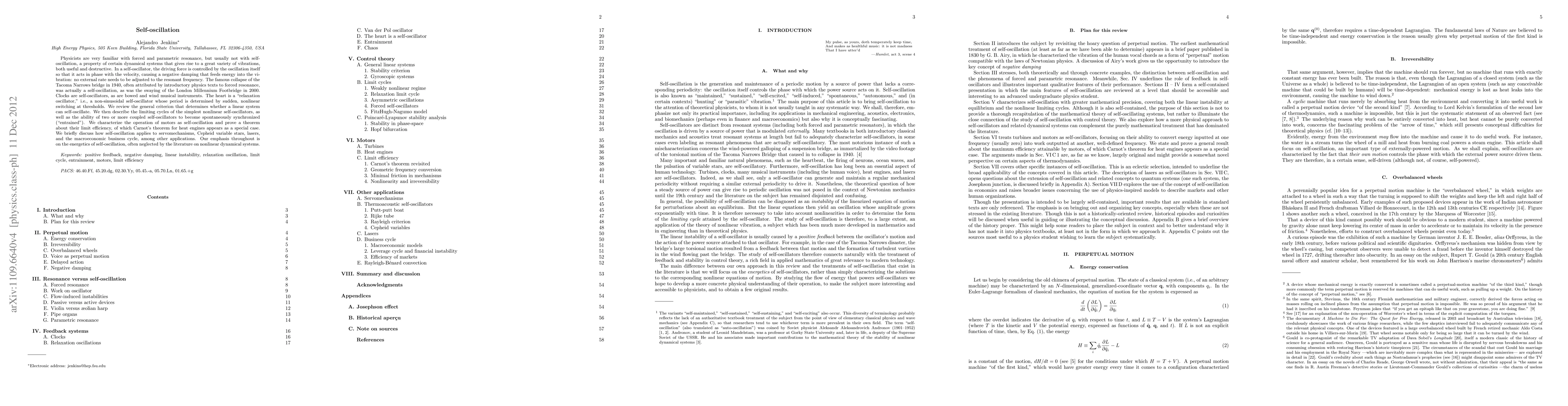 Physicists are very familiar with forced and parametric resonance, but usually not with self-oscillation, a property of certain dynamical systems that gives rise to a great variety of vibrations, both useful and destructive. In a self-oscillator, the driving force is controlled by the oscillation itself so that it acts in phase with the velocity, causing a negative damping that feeds energy into the vibration: no external rate needs to be adjusted to the resonant frequency. The famous collapse of the Tacoma Narrows bridge in 1940, often attributed by introductory physics texts to forced resonance, was actually a self-oscillation, as was the swaying of the London Millennium Footbridge in 2000. Clocks are self-oscillators, as are bowed and wind musical instruments. The heart is a "relaxation oscillator," i.e., a non-sinusoidal self-oscillator whose period is determined by sudden, nonlinear switching at thresholds. We review the general criterion that determines whether a linear system can self-oscillate. We then describe the limiting cycles of the simplest nonlinear self-oscillators, as well as the ability of two or more coupled self-oscillators to become spontaneously synchronized ("entrained"). We characterize the operation of motors as self-oscillation and prove a theorem about their limit efficiency, of which Carnot's theorem for heat engines appears as a special case. We briefly discuss how self-oscillation applies to servomechanisms, Cepheid variable stars, lasers, and the macroeconomic business cycle, among other applications. Our emphasis throughout is on the energetics of self-oscillation, often neglected by the literature on nonlinear dynamical systems.