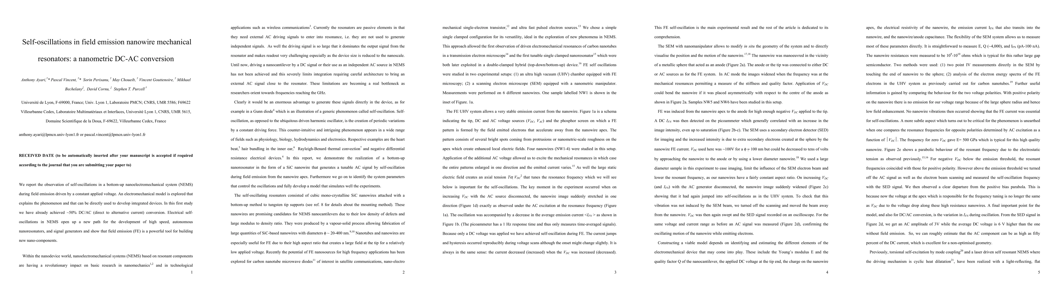We report the observation of self-oscillations in a bottom-up nanoelectromechanical system (NEMS) during field emission driven by a constant applied voltage. An electromechanical model is explored that explains the phenomenon and that can be directly used to develop integrated devices. In this first study we have already achieved ~50% DC/AC (direct to alternative current) conversion. Electrical self-oscillations in NEMS open up a new path for the development of high speed, autonomous nanoresonators, and signal generators and show that field emission (FE) is a powerful tool for building new nano-components.