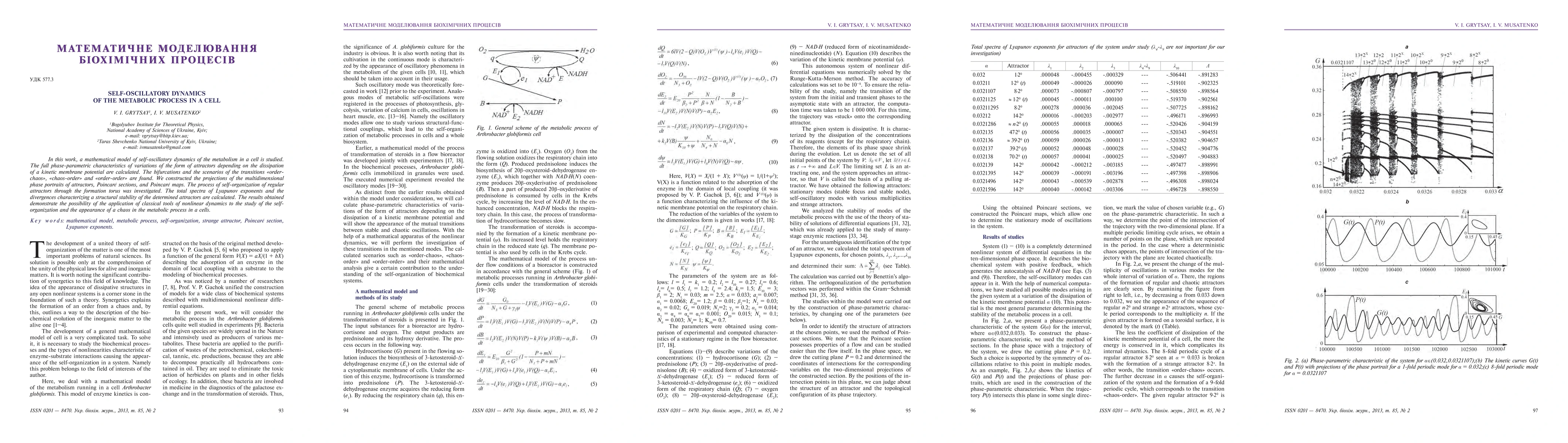 In this work, a mathematical model of self-oscillatory dynamics of the metabolism in a cell is studied. The full phase-parametric characteristics of variations of the form of attractors depending on the dissipation of a kinetic membrane potential are calculated. The bifurcations and the scenarios of the transitions {\guillemotleft}order-chaos{\guillemotright}, {\guillemotleft}chaos-order{\guillemotright} and {\guillemotleft}order-order{\guillemotright} are found. We constructed the projections of the multidimensional phase portraits of attractors, Poincar\'e sections, and Poincar\'e maps. The process of self-organization of regular attractors through the formation torus was investigated. The total spectra of Lyapunov exponents and the divergences characterizing a structural stability of the determined attractors are calculated. The results obtained demonstrate the possibility of the application of classical tools of nonlinear dynamics to the study of the self-organization and the appearance of a chaos in the metabolic process in a cells.