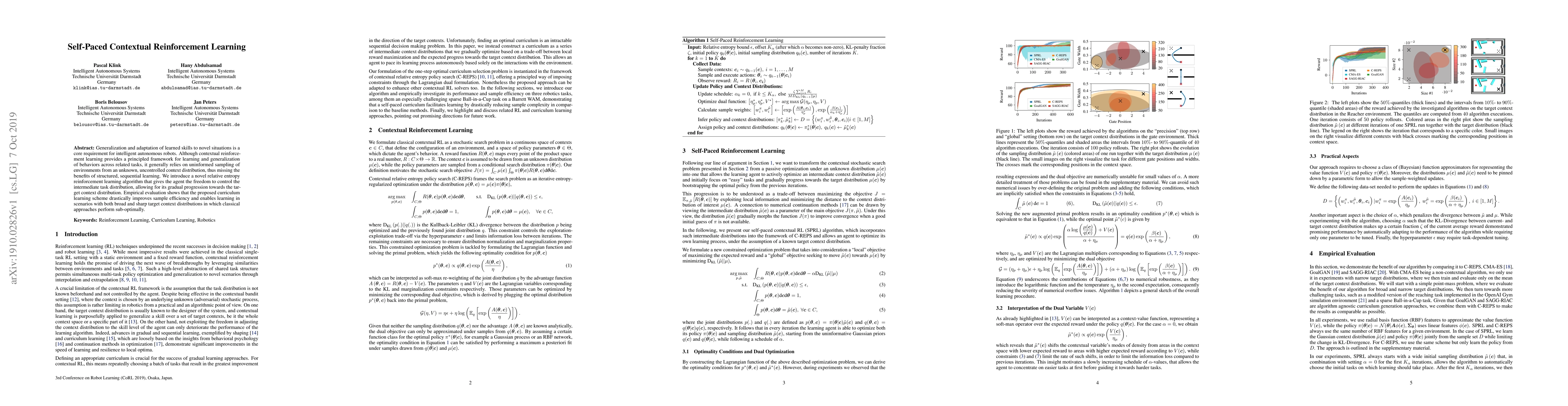 Generalization and adaptation of learned skills to novel situations is a core requirement for intelligent autonomous robots. Although contextual reinforcement learning provides a principled framework for learning and generalization of behaviors across related tasks, it generally relies on uninformed sampling of environments from an unknown, uncontrolled context distribution, thus missing the benefits of structured, sequential learning. We introduce a novel relative entropy reinforcement learning algorithm that gives the agent the freedom to control the intermediate task distribution, allowing for its gradual progression towards the target context distribution. Empirical evaluation shows that the proposed curriculum learning scheme drastically improves sample efficiency and enables learning in scenarios with both broad and sharp target context distributions in which classical approaches perform sub-optimally.