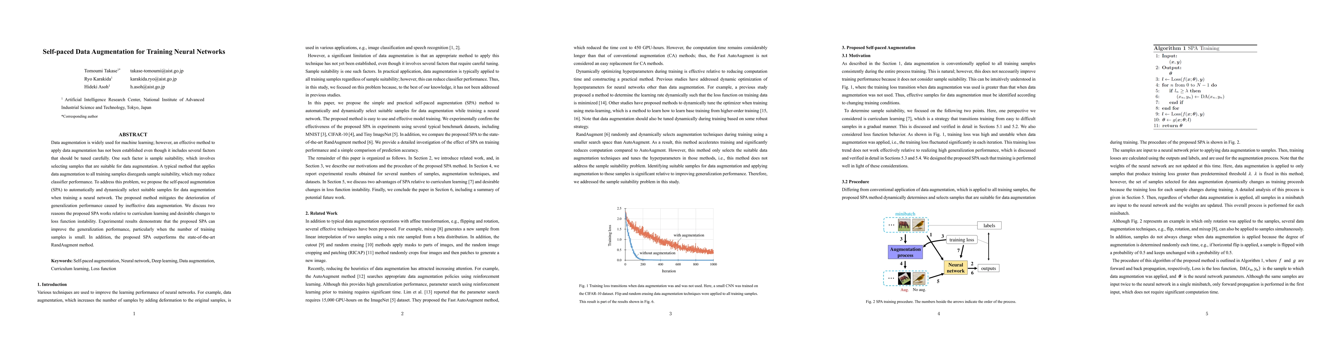 The paper proposes self-paced augmentation (SPA) to dynamically select suitable training samples for data augmentation, improving neural network generalization performance. SPA outperforms RandAugment, especially with limited training data, by addressing sample suitability and loss function instability.