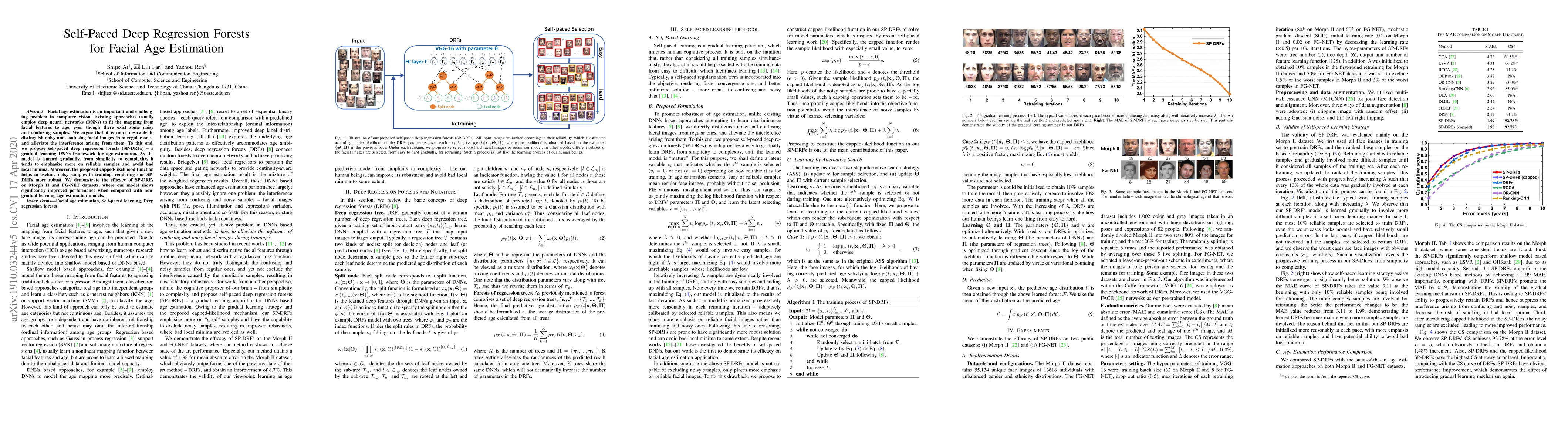 The paper proposes self-paced deep regression forests (SP-DRFs) for facial age estimation, which gradually learn from simpler to more complex samples to emphasize reliable data and avoid noisy samples, achieving state-of-the-art performance on Morph II and FG-NET datasets. The capped-likelihood function further enhances robustness by excluding noisy training samples.