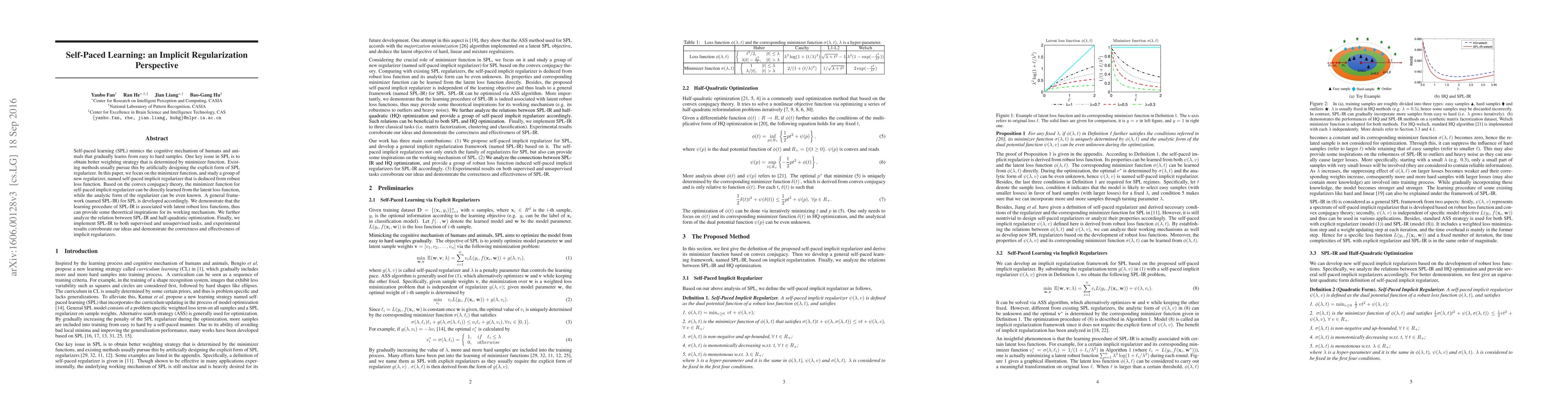 Self-paced learning (SPL) mimics the cognitive mechanism of humans and animals that gradually learns from easy to hard samples. One key issue in SPL is to obtain better weighting strategy that is determined by minimizer function. Existing methods usually pursue this by artificially designing the explicit form of SPL regularizer. In this paper, we focus on the minimizer function, and study a group of new regularizer, named self-paced implicit regularizer that is deduced from robust loss function. Based on the convex conjugacy theory, the minimizer function for self-paced implicit regularizer can be directly learned from the latent loss function, while the analytic form of the regularizer can be even known. A general framework (named SPL-IR) for SPL is developed accordingly. We demonstrate that the learning procedure of SPL-IR is associated with latent robust loss functions, thus can provide some theoretical inspirations for its working mechanism. We further analyze the relation between SPL-IR and half-quadratic optimization. Finally, we implement SPL-IR to both supervised and unsupervised tasks, and experimental results corroborate our ideas and demonstrate the correctness and effectiveness of implicit regularizers.