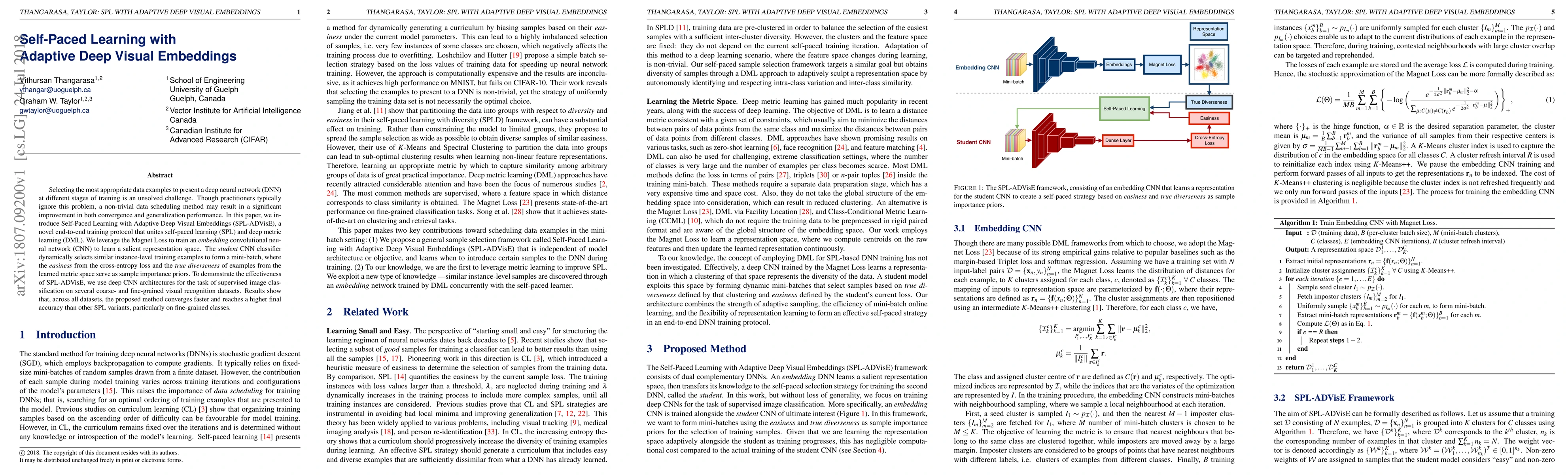 A new method called Self-Paced Learning with Adaptive Deep Visual Embeddings is introduced to improve convergence and generalization performance in deep neural networks, achieving faster training and higher accuracy on various visual recognition datasets.