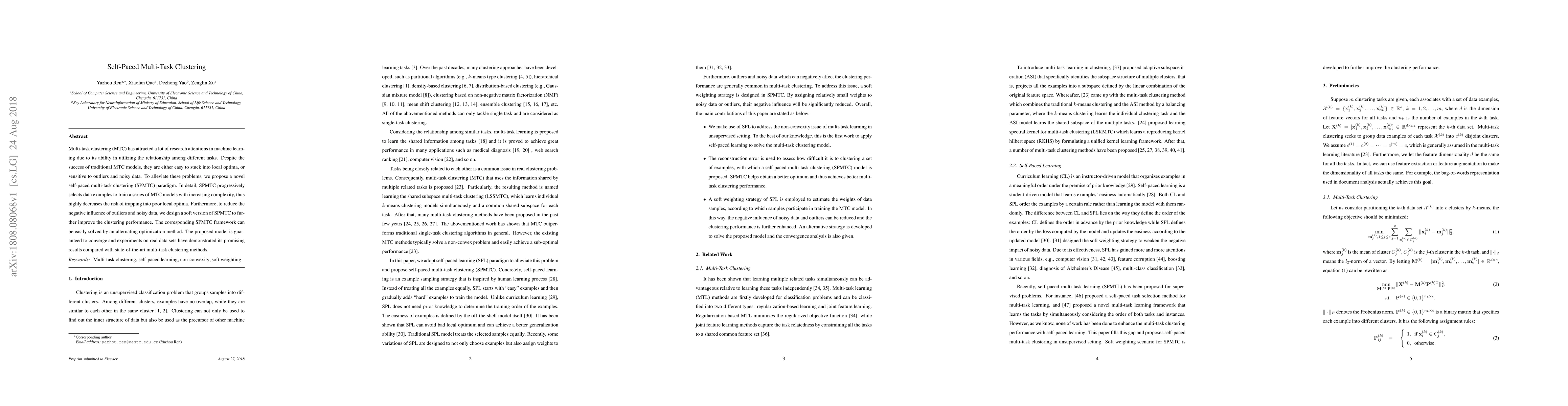 The paper proposes a self-paced multi-task clustering (SPMTC) paradigm that progressively selects data examples to train increasingly complex models, reducing local optima risks and improving robustness to outliers and noisy data. Experiments show SPMTC outperforms existing methods on real datasets.