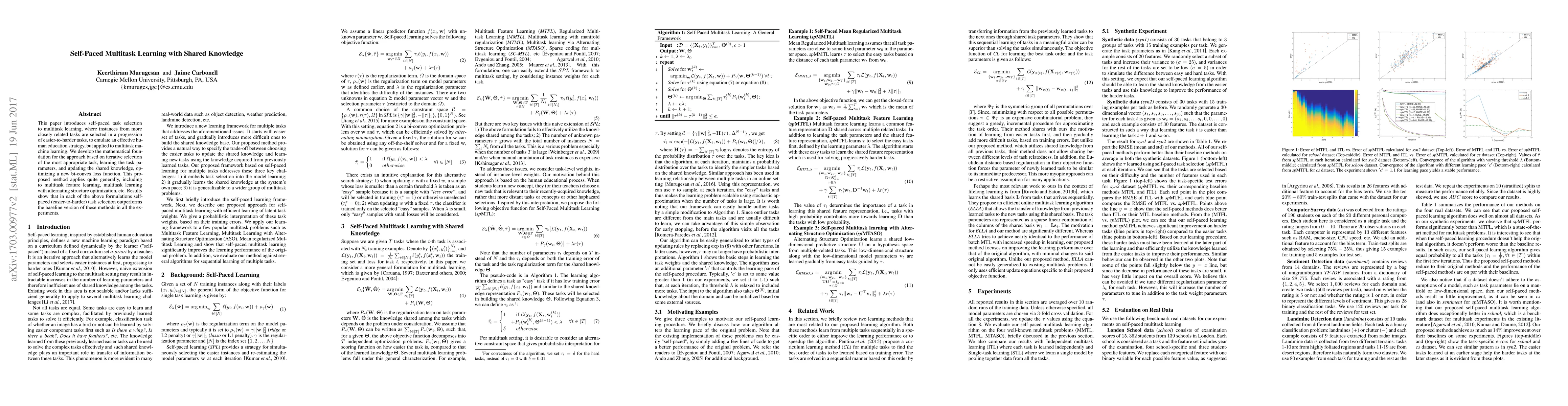 This paper proposes a self-paced multitask learning method that selects tasks in an easier-to-harder progression, optimizing a bi-convex loss function and updating shared knowledge iteratively. The approach outperforms baseline methods across various multitask learning formulations.