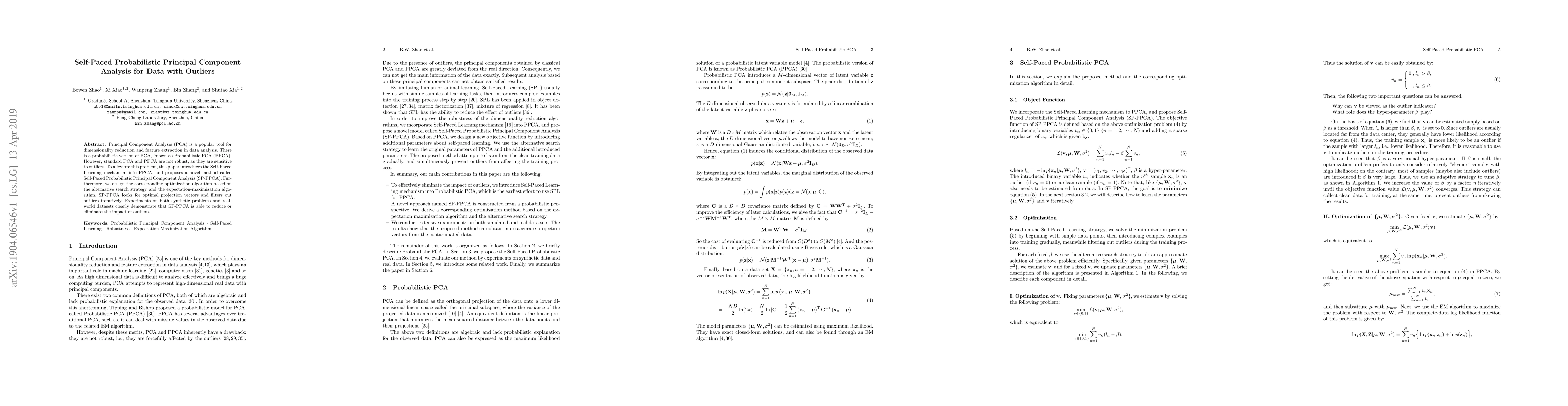 This paper proposes Self-Paced Probabilistic Principal Component Analysis (SP-PPCA) to enhance the robustness of Probabilistic PCA (PPCA) by incorporating a Self-Paced Learning mechanism, which iteratively identifies and filters outliers, demonstrating improved performance on both synthetic and real datasets.