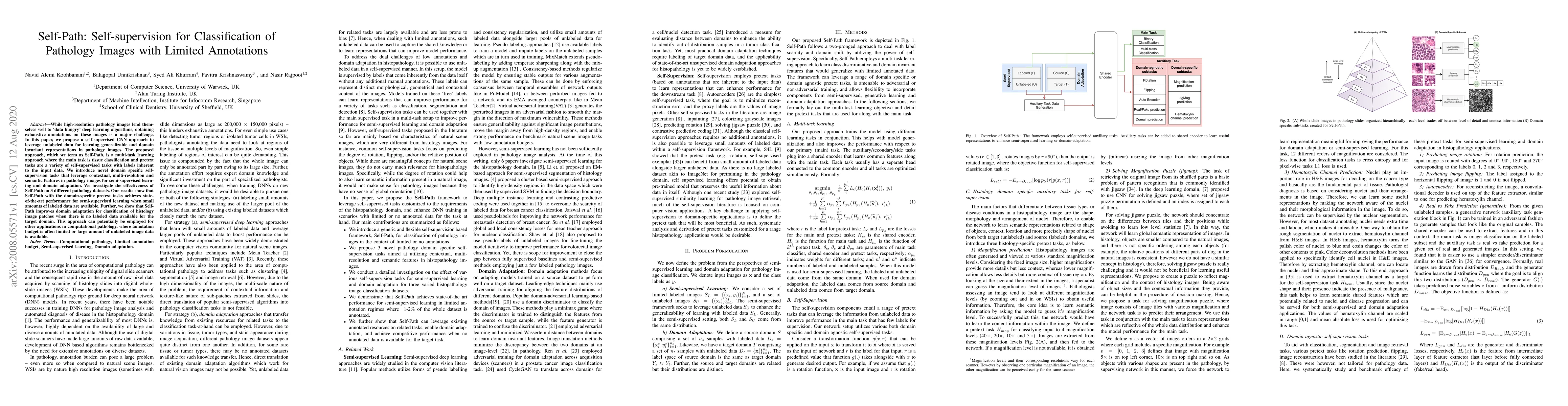 The paper proposes Self-Path, a self-supervised CNN method for classifying pathology images with limited annotations, leveraging unlabeled data through multi-task learning and domain-specific pretext tasks. The approach achieves state-of-the-art semi-supervised learning performance and enhances domain adaptation for histology image classification.