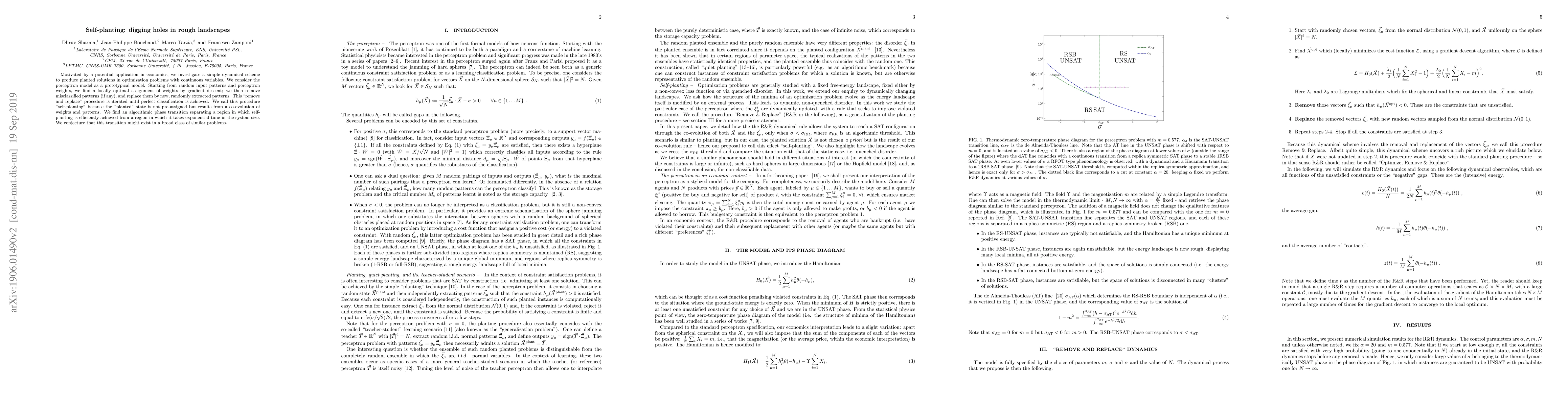 Motivated by a potential application in economics, we investigate a simple dynamical scheme to produce planted solutions in optimization problems with continuous variables. We consider the perceptron model as a prototypical model. Starting from random input patterns and perceptron weights, we find a locally optimal assignment of weights by gradient descent; we then remove misclassified patterns (if any), and replace them by new, randomly extracted patterns. This "remove and replace" procedure is iterated until perfect classification is achieved. We call this procedure "self-planting" because the "planted" state is not pre-assigned but results from a co-evolution of weights and patterns. We find an algorithmic phase transition separating a region in which self-planting is efficiently achieved from a region in which it takes exponential time in the system size. We conjecture that this transition might exist in a broad class of similar problems.