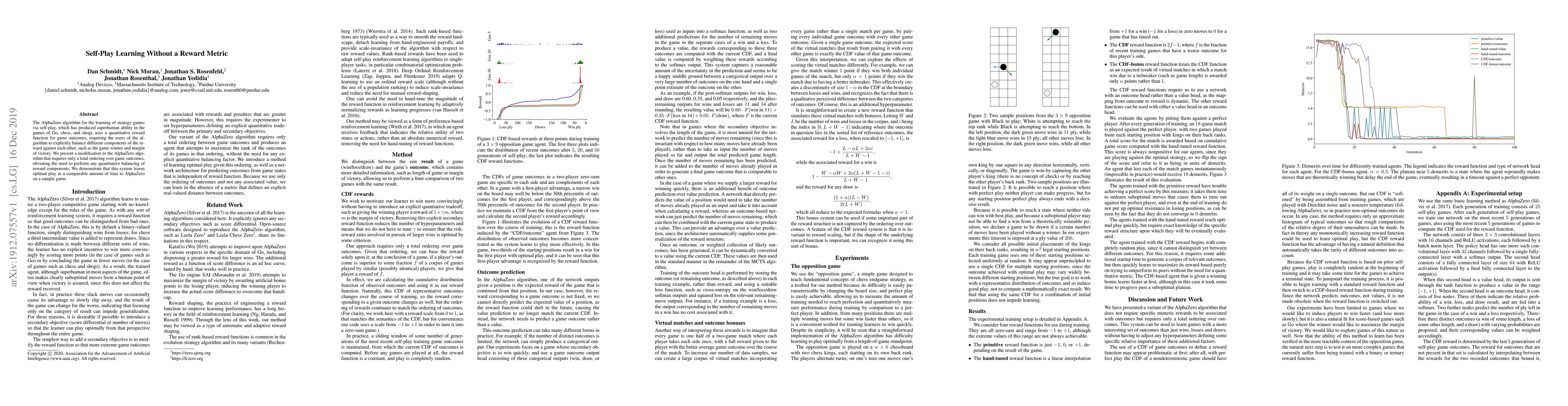 The primary technical contribution is the development of a self-play learning algorithm that uses a CDF of game outcomes as a reward function, eliminating the need for a quantitative reward metric.