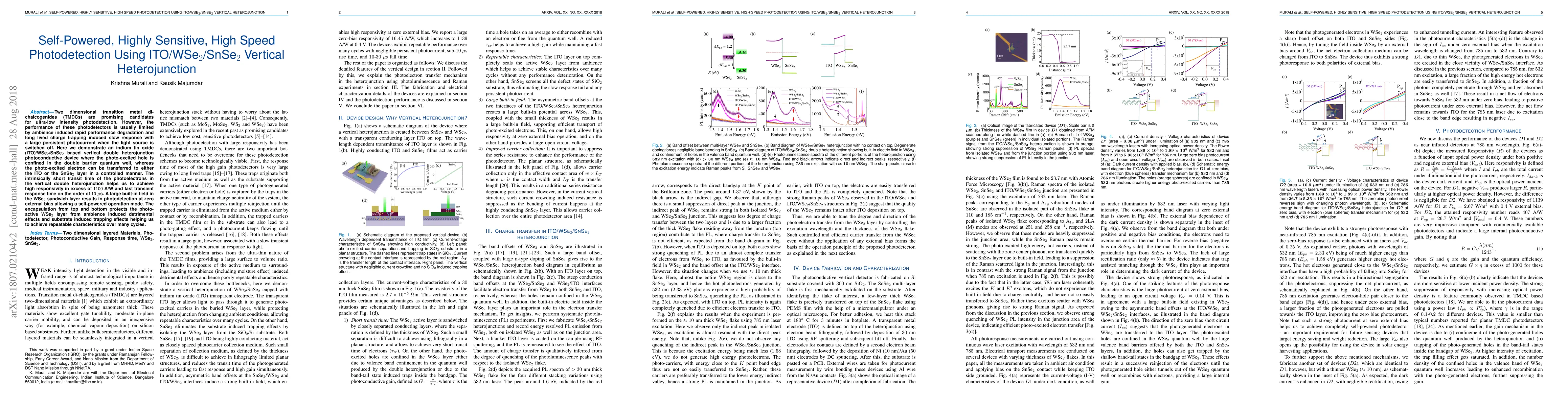 Two dimensional transition metal di-chalcogenides (TMDCs) are promising candidates for ultra-low intensity photodetection. However, the performance of these photodetectors is usually limited by ambience induced rapid performance degradation and long lived charge trapping induced slow response with a large persistent photocurrent when the light source is switched off. Here we demonstrate an indium tin oxide (ITO)/WSe$_2$/SnSe$_2$ based vertical double heterojunction photoconductive device where the photo-excited hole is confined in the double barrier quantum well, whereas the photo-excited electron can be transferred to either the ITO or the SnSe$_2$ layer in a controlled manner. The intrinsically short transit time of the photoelectrons in the vertical double heterojunction helps us to achieve high responsivity in excess of $1100$ A/W and fast transient response time on the order of $10$ $\mu$s. A large built-in field in the WSe$_2$ sandwich layer results in photodetection at zero external bias allowing a self-powered operation mode. The encapsulation from top and bottom protects the photo-active WSe$_2$ layer from ambience induced detrimental effects and substrate induced trapping effects helping us to achieve repeatable characteristics over many cycles.