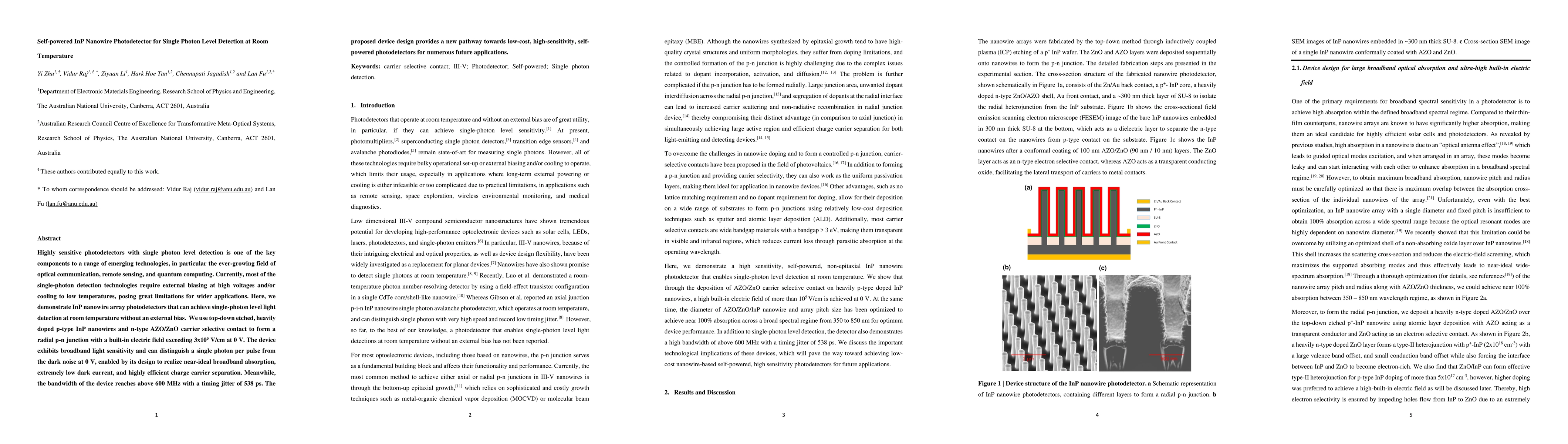 Highly sensitive photodetectors with single photon level detection is one of the key components to a range of emerging technologies, in particular the ever-growing field of optical communication, remote sensing, and quantum computing. Currently, most of the single-photon detection technologies require external biasing at high voltages and/or cooling to low temperatures, posing great limitations for wider applications. Here, we demonstrate InP nanowire array photodetectors that can achieve single-photon level light detection at room temperature without an external bias. We use top-down etched, heavily doped p-type InP nanowires and n-type AZO/ZnO carrier selective contact to form a radial p-n junction with a built-in electric field exceeding 3x10^5 V/cm at 0 V. The device exhibits broadband light sensitivity and can distinguish a single photon per pulse from the dark noise at 0 V, enabled by its design to realize near-ideal broadband absorption, extremely low dark current, and highly efficient charge carrier separation. Meanwhile, the bandwidth of the device reaches above 600 MHz with a timing jitter of 538 ps. The proposed device design provides a new pathway towards low-cost, high-sensitivity, self-powered photodetectors for numerous future applications.
