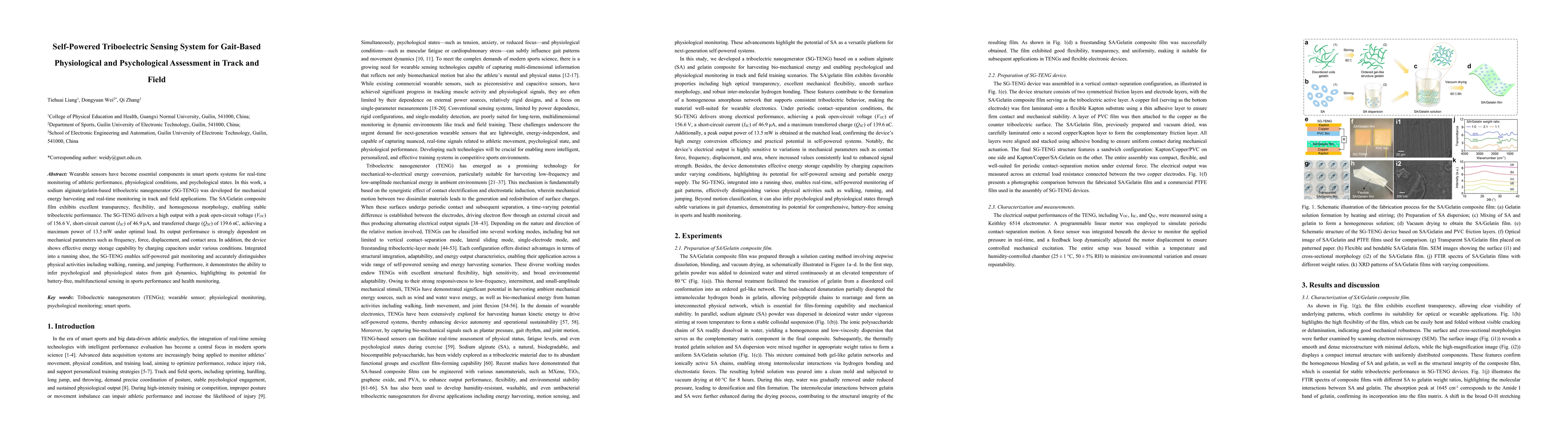 Wearable sensors are critical components in smart sports systems for real-time monitoring of athletic performance, physiological conditions, and psychological states. In this work, a sodium alginate/gelatin-based triboelectric nanogenerator (SG-TENG) was developed for mechanical energy harvesting and real-time sensing in track and field applications. The SA/gelatin composite film exhibits high transparency, good flexibility, and uniform morphology, enabling stable triboelectric output. The SG-TENG delivers high electrical performance, including an open-circuit voltage (Voc) of 156.6 V, short-circuit current (Isc) of 46.9 uA, and transferred charge (Qsc) of 139.6 nC, with a maximum power of 13.5 mW under optimal loading. Its output characteristics are closely related to mechanical parameters such as frequency, force, displacement, and contact area. Furthermore, the device demonstrates energy storage capability by charging capacitors under various dynamic conditions. Integrated into a running shoe, the SG-TENG enables self-powered gait monitoring and can distinguish between walking, running, and jumping. It also shows potential for inferring psychological and physiological states from gait features, offering a promising solution for battery-free, multifunctional sensing in sports performance evaluation and health monitoring.