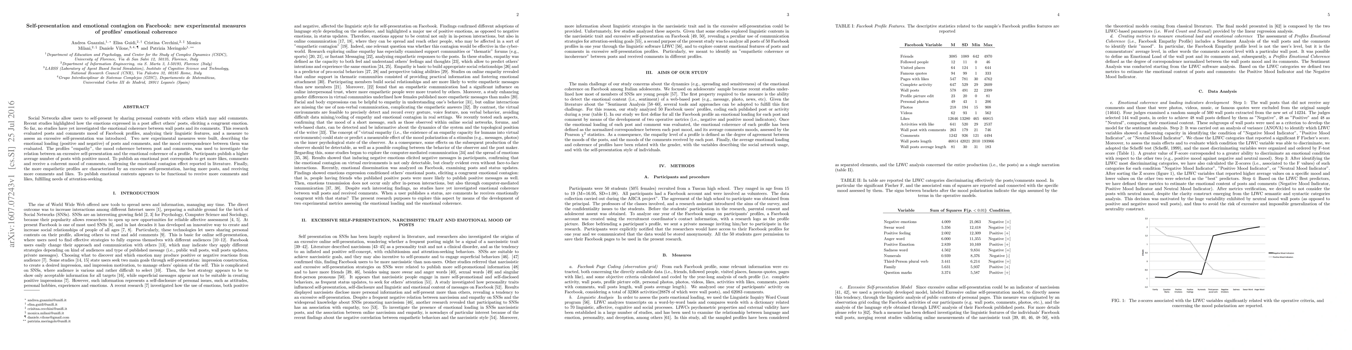 Social Networks allow users to self-present by sharing personal contents with others which may add comments. Recent studies highlighted how the emotions expressed in a post affect others' posts, eliciting a congruent emotion. So far, no studies have yet investigated the emotional coherence between wall posts and its comments. This research evaluated posts and comments mood of Facebook profiles, analyzing their linguistic features, and a measure to assess an excessive self-presentation was introduced. Two new experimental measures were built, describing the emotional loading (positive and negative) of posts and comments, and the mood correspondence between them was evaluated. The profiles "empathy", the mood coherence between post and comments, was used to investigate the relation between an excessive self-presentation and the emotional coherence of a profile. Participants publish a higher average number of posts with positive mood. To publish an emotional post corresponds to get more likes, comments and receive a coherent mood of comments, confirming the emotional contagion effect reported in literature. Finally, the more empathetic profiles are characterized by an excessive self-presentation, having more posts, and receiving more comments and likes. To publish emotional contents appears to be functional to receive more comments and likes, fulfilling needs of attention-seeking.
