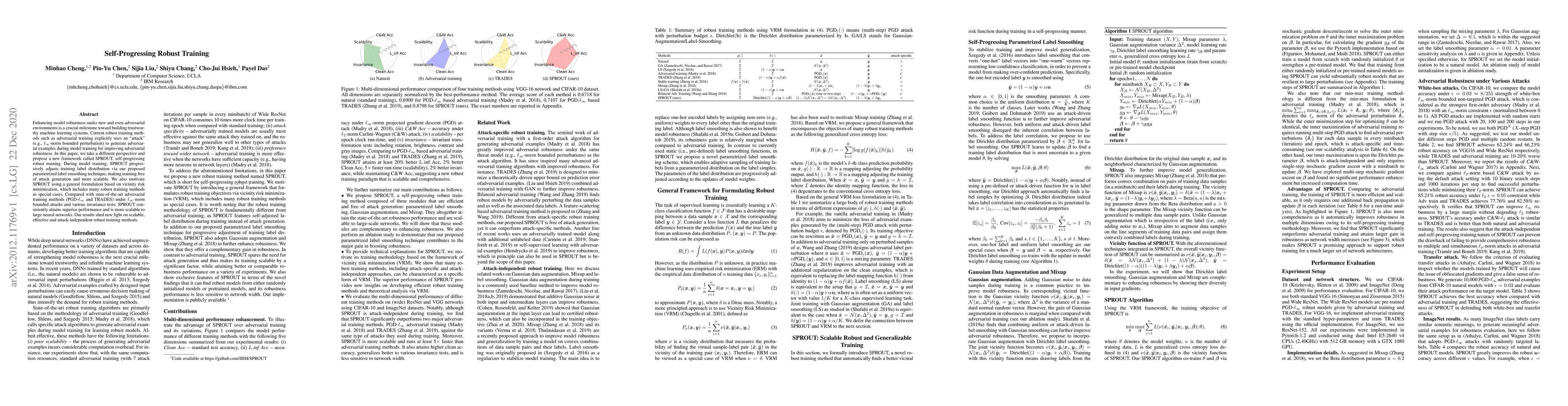 This paper introduces SPROUT, a self-progressing robust training framework that leverages parametrized label smoothing to enhance model robustness without generating adversarial examples. SPROUT achieves superior performance compared to state-of-the-art adversarial training methods and scales better to large neural networks.