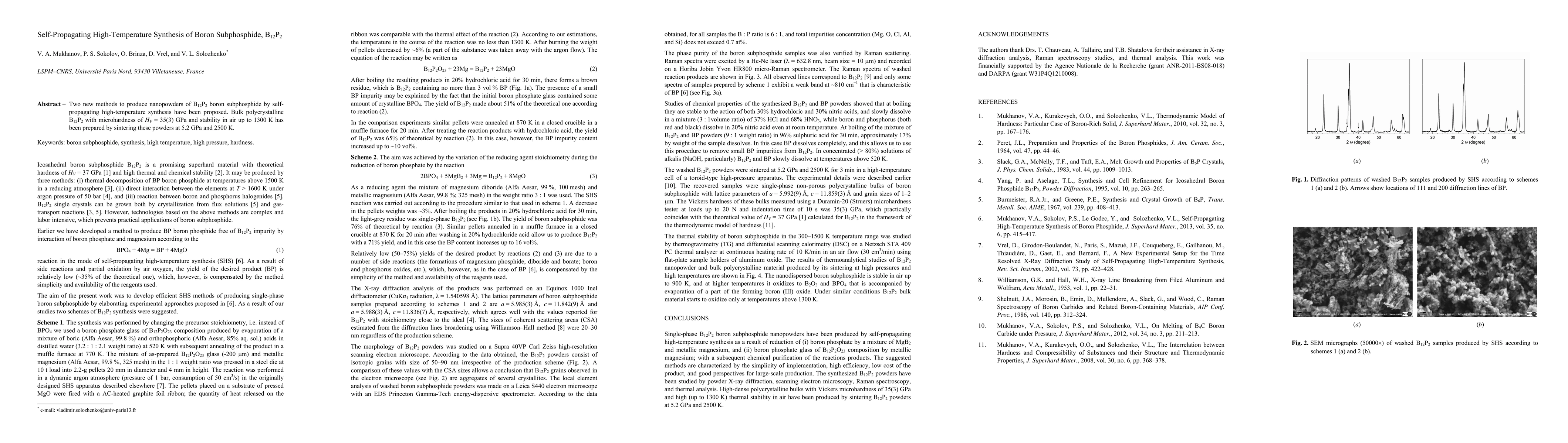 This paper proposes two new methods for producing boron subphosphide (B12P2) nanopowders via self-propagating high-temperature synthesis, resulting in bulk polycrystalline material with high microhardness and air stability up to 1300 K.