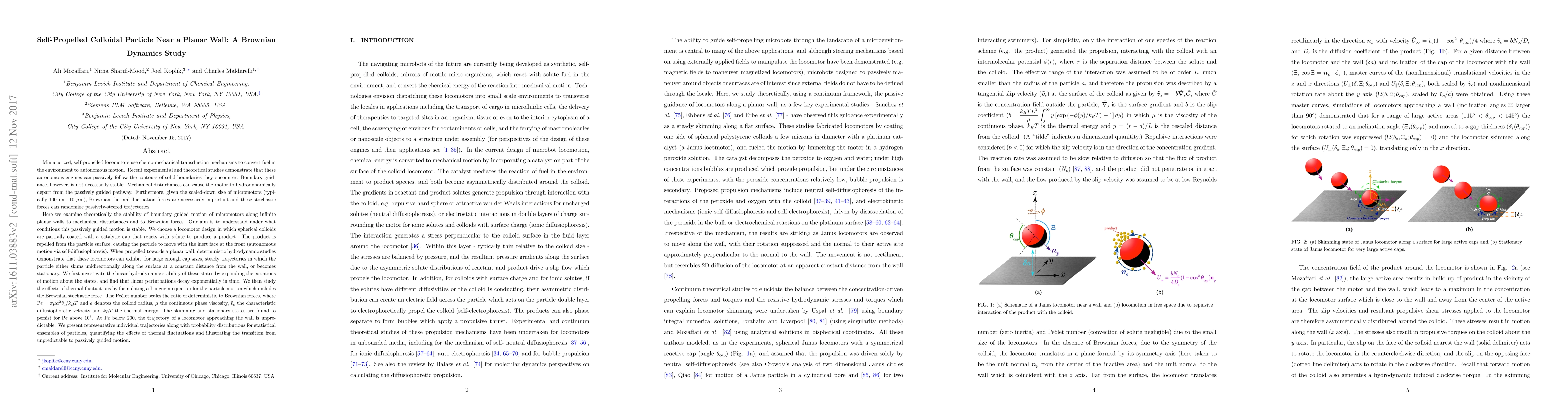 Miniaturized, self-propelled locomotors use chemo-mechanical transduction mechanisms to convert fuel in the environment to autonomous motion. Recent experimental and theoretical studies demonstrate that these autonomous engines can passively follow the contours of solid boundaries they encounter. Boundary guidance, however, is not necessarily stable: Mechanical disturbances can cause the motor to hydrodynamically depart from the passively guided pathway. Furthermore, given the scaled-down size of micromotors (typically 100 nm -10 $\mu$m), Brownian thermal fluctuation forces are necessarily important and these stochastic forces can randomize passively-steered trajectories. Here we examine theoretically the stability of boundary guided motion of micromotors along infinite planar walls to mechanical disturbances and to Brownian forces. Our aim is to understand under what conditions this passively guided motion is stable. We choose a locomotor design in which spherical colloids are partially coated with a catalytic cap that reacts with solute to produce a product. The product is repelled from the particle surface, causing the particle to move with the inert face at the front (autonomous motion via self-diffusiophoresis). When propelled towards a planar wall, deterministic hydrodynamic studies demonstrate that these locomotors can exhibit, for large enough cap sizes, steady trajectories in which the particle either skims unidirectionally along the surface at a constant distance from the wall, or becomes stationary. We first investigate the linear hydrodynamic stability of these states by expanding the equations of motion about the states, and find that linear perturbations decay exponentially in time. We then study the effects of thermal fluctuations by formulating a Langevin equation for the particle motion which includes the Brownian stochastic force...