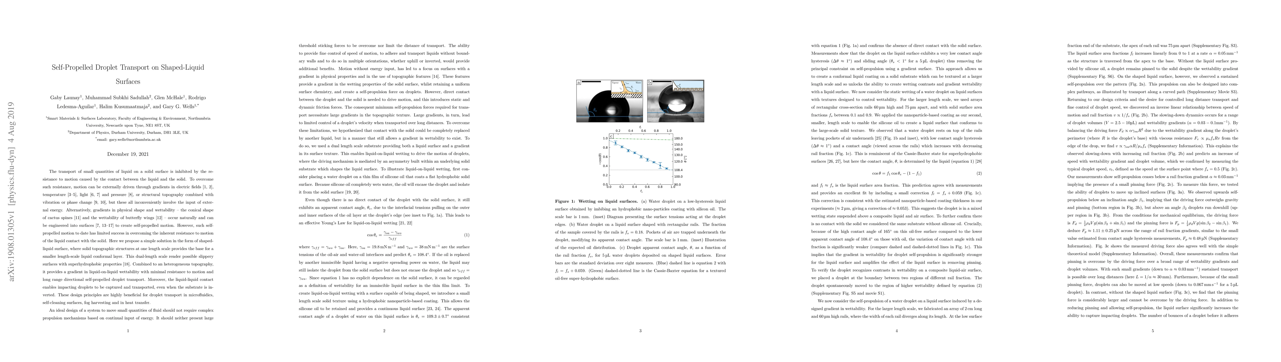 This paper proposes shaped-liquid surfaces with dual-length scale topographic structures to enable self-propelled droplet transport with minimal resistance. The design leverages a combination of solid and liquid conformal layers to create slippery, superhydrophobic surfaces that facilitate long-range directional transport, even when inverted.