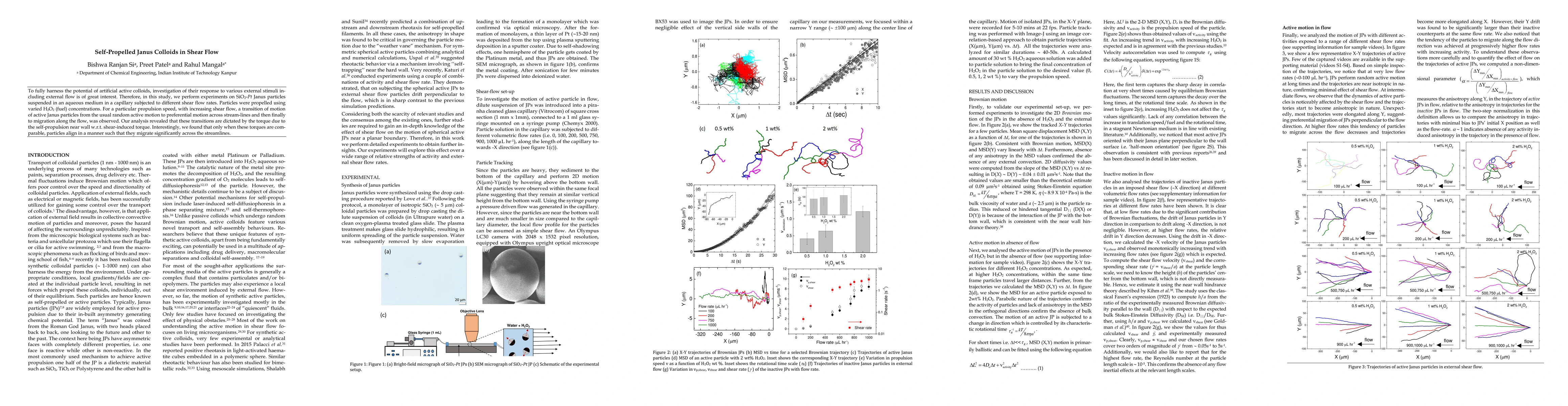 This study investigates the behavior of SiO2-Pt Janus colloids under shear flow, revealing transitions in their motion from random to preferential and finally to migration along the flow, driven by the balance between self-propulsion and shear-induced torques.