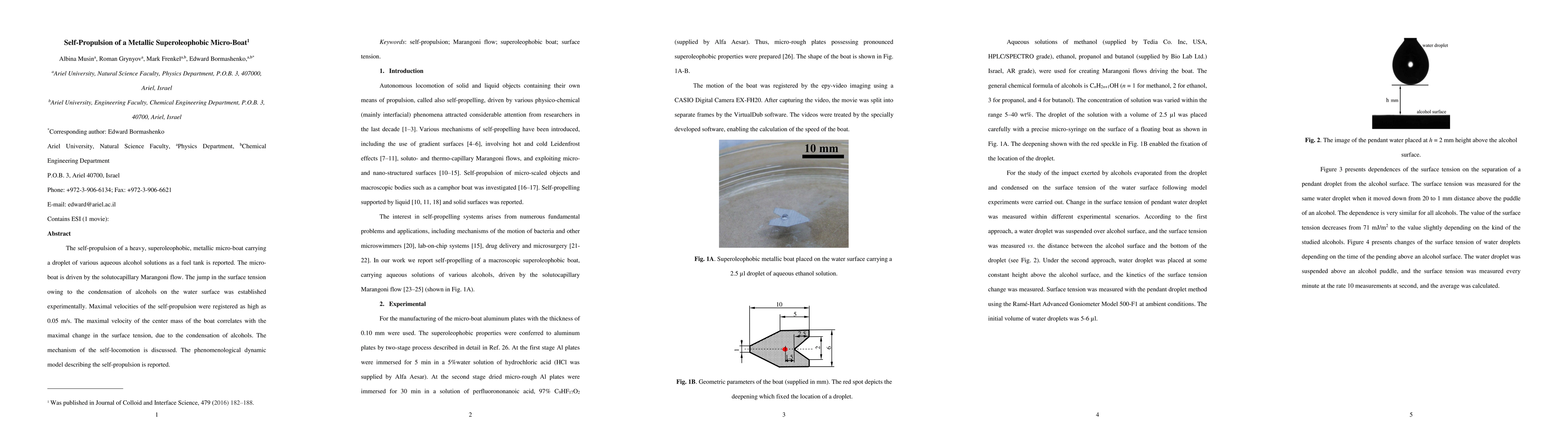 The self-propulsion of a heavy, superoleophobic, metallic micro-boat carrying a droplet of various aqueous alcohol solutions as a fuel tank is reported. The micro boat is driven by the solutocapillary Marangoni flow. The jump in the surface tension owing to the condensation of alcohols on the water surface was established experimentally. Maximal velocities of the self-propulsion were registered as high as 0.05 m/s. The maximal velocity of the center mass of the boat correlates with the maximal change in the surface tension, due to the condensation of alcohols. The mechanism of the self-locomotion is discussed. The phenomenological dynamic model describing the self-propulsion is reported.
