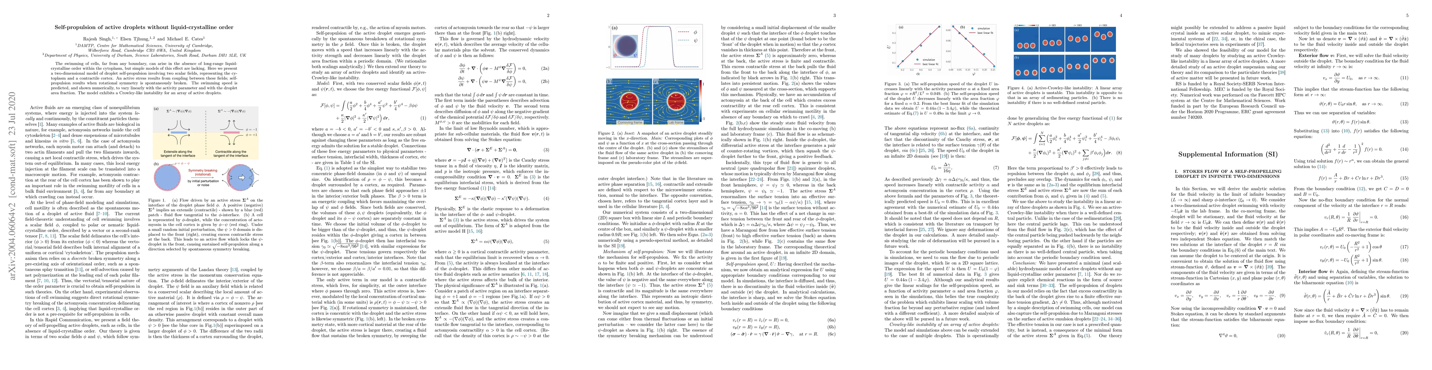 This research proposes a two-dimensional model for the self-propulsion of active droplets that lacks long-range liquid-crystalline order, explaining the phenomenon through coupling between cytoplasm and contractile cortex fields. The model predicts linear variations in swimming speed with activity and droplet area fraction, and it shows a Crowley-like instability in arrays of such droplets.