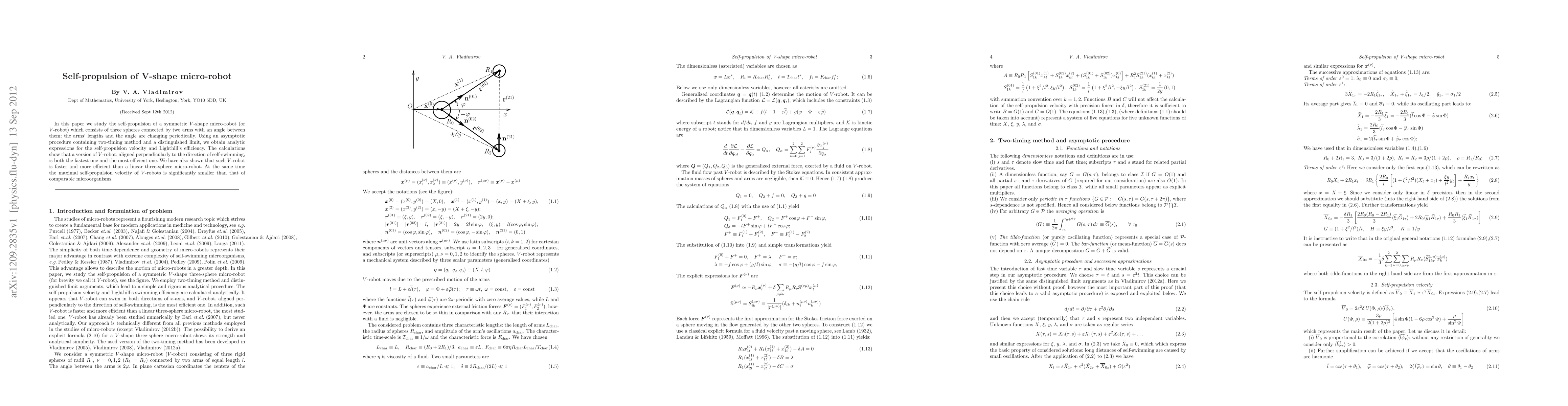 In this paper we study the self-propulsion of a symmetric V-shape micro-robot (or V-robot) which consists of three spheres connected by two arms with an angle between them; the arms' lengths and the angle are changing periodically. Using an asymptotic procedure containing two-timing method and a distinguished limit, we obtain analytic expressions for the self-propulsion velocity and Lighthill's efficiency. The calculations show that a version of V-robot, aligned perpendicularly to the direction of self-swimming, is both the fastest one and the most efficient one. We have also shown that such $V$-robot is faster and more efficient than a linear three-sphere micro-robot. At the same time the maximal self-propulsion velocity of V-robots is significantly smaller than that of comparable microorganisms.
