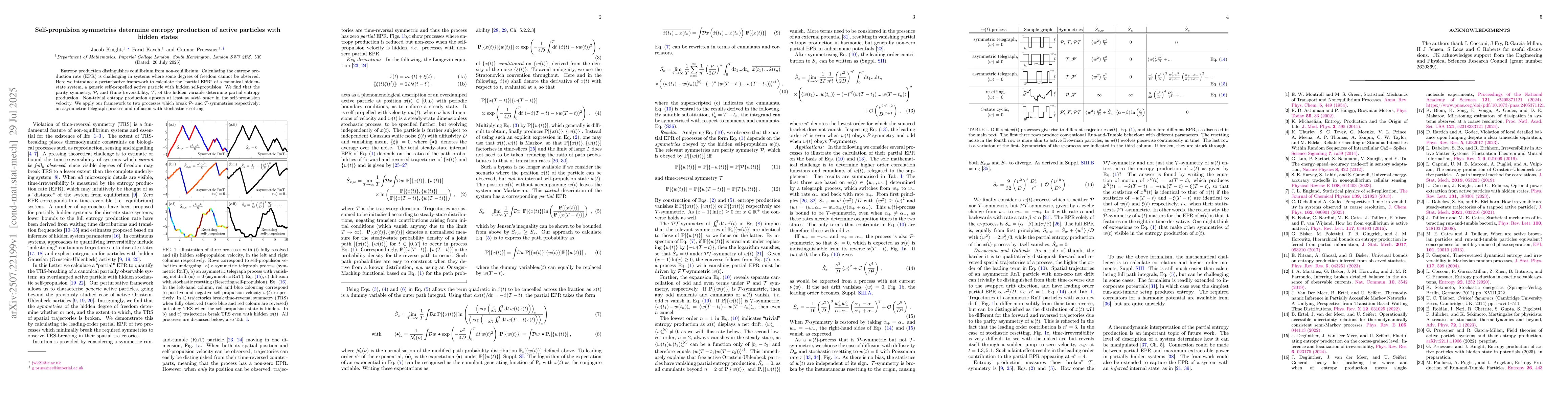 Entropy production distinguishes equilibrium from non-equilibrium. Calculating the entropy production rate (EPR) is challenging in systems where some degrees of freedom cannot be observed. Here we introduce a perturbative framework to calculate the ``partial EPR'' of a canonical hidden-state system, a generic self-propelled active particle with hidden self-propulsion. We find that the parity symmetry, P, and (time-)reversibility, T, of the hidden variable determine partial entropy production. Non-trivial entropy production appears at least at sixth order in the self-propulsion velocity. We apply our framework to two processes which break P- and T-symmetries respectively: an asymmetric telegraph process and diffusion with stochastic resetting.